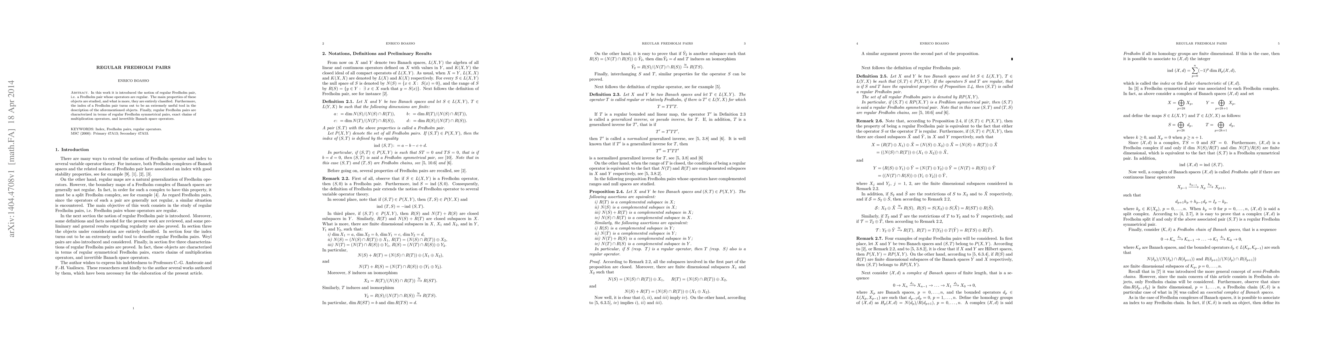 This paper introduces the concept of regular Fredholm pairs, whose operators are regular, and classifies them using the index of a Fredholm pair as a key tool. It also characterizes regular Fredholm pairs in relation to symmetrical pairs, exact multiplication chains, and invertible Banach space operators.