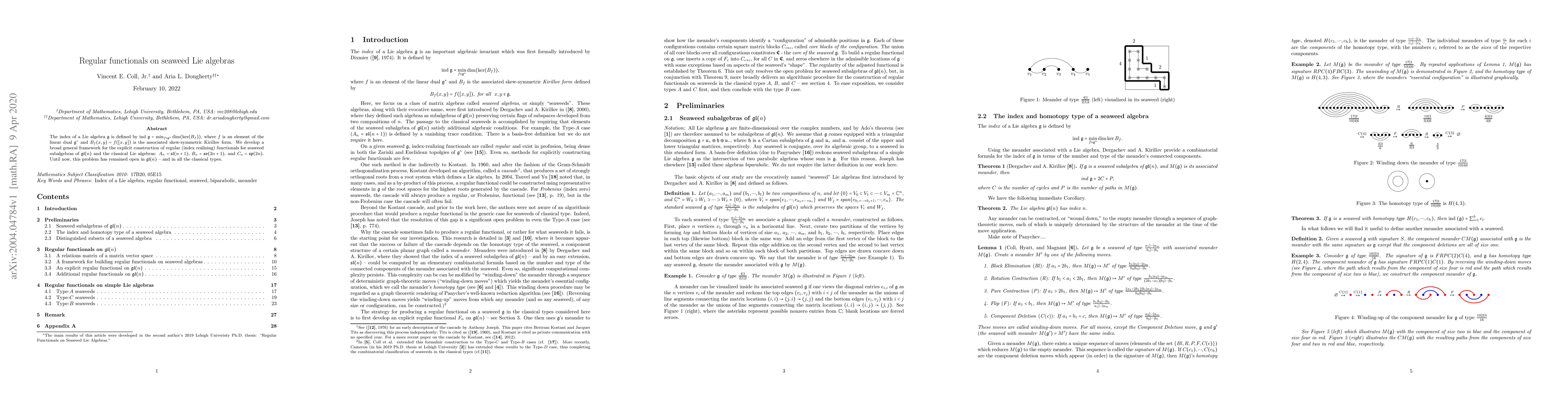 Researchers have developed a framework for constructing regular functionals on seaweed Lie algebras of $rak{gl}(n)$ and classical types $A_n$, $B_n$, and $C_n$, resolving a long-standing open problem in Lie theory.