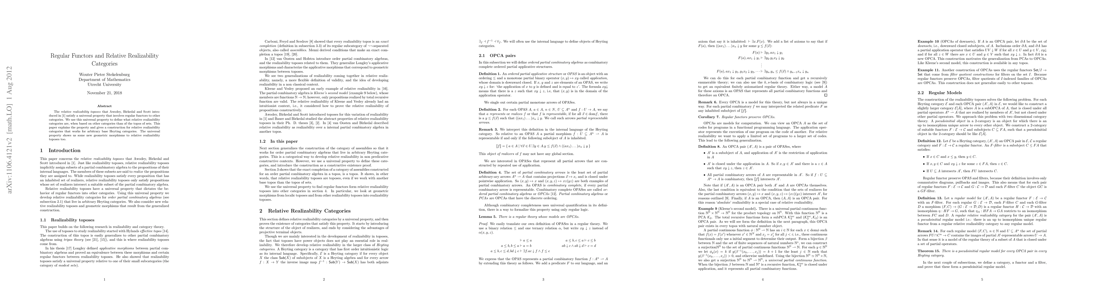 This paper defines relative realizability categories using regular functors and their universal properties, extending the concept beyond the topos of sets to any base Heyting category, and identifies new geometric morphisms to these toposes.
