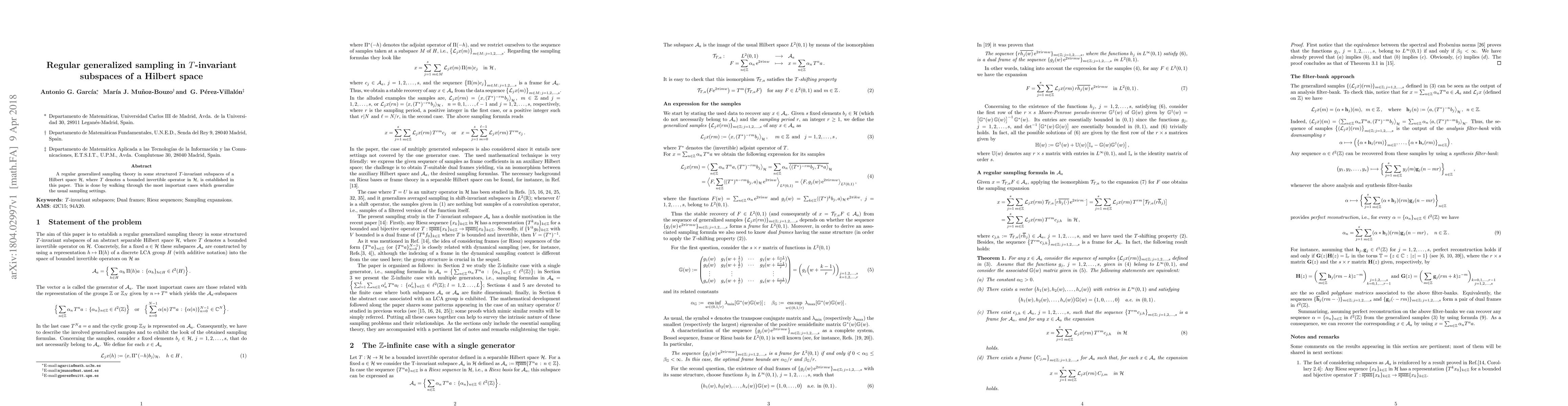 The paper establishes a regular generalized sampling theory in structured T-invariant subspaces of a Hilbert space by examining important cases that generalize usual sampling settings.