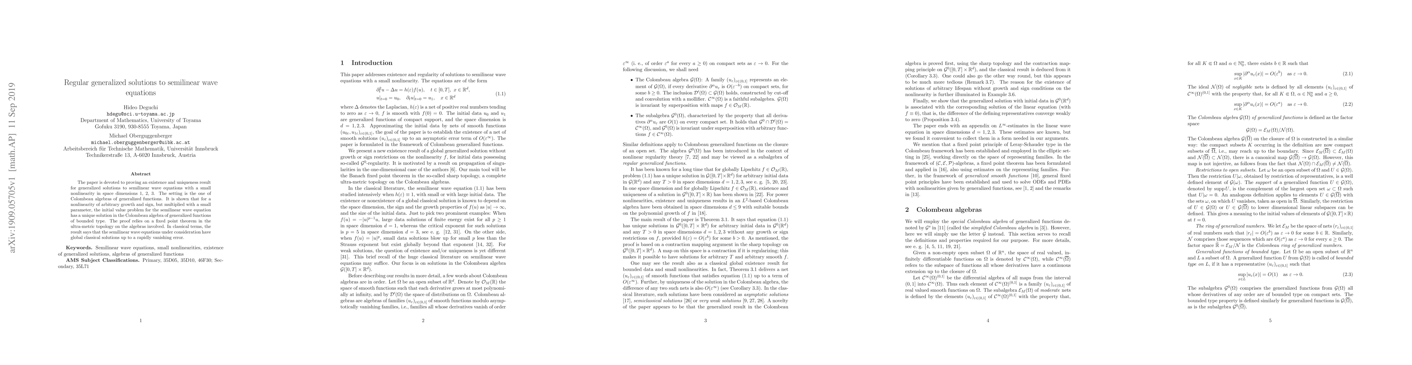 The paper proves the existence and uniqueness of generalized solutions to semilinear wave equations with small nonlinearity in dimensions 1, 2, and 3 using Colombeau algebras. The solution is shown to exist globally with a small error term, relying on a fixed point theorem in ultra-metric topology.