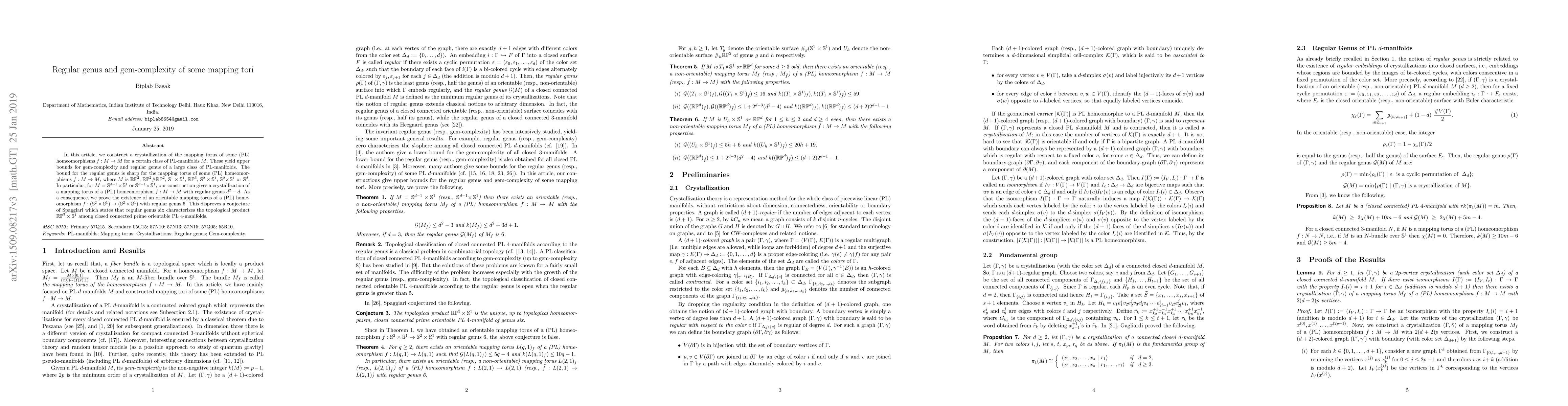 In this article, we construct a crystallization of the mapping torus of some (PL) homeomorphisms $f:M \to M$ for a certain class of PL-manifolds $M$. These yield upper bounds for gem-complexity and regular genus of a large class of PL-manifolds. The bound for the regular genus is sharp for the mapping torus of some (PL) homeomorphisms $f:M \to M$, where $M$ is $\mathbb{RP}^2$, $\mathbb{RP}^2\#\mathbb{RP}^2$, $\mathbb{S}^1\times \mathbb{S}^1$, $\mathbb{RP}^3$, $\mathbb{S}^{2} \times \mathbb{S}^1$, $\mathbb{S}^{\hspace{.2mm}2} \mbox{$\times \hspace{-2.6mm}_{-}$} \, \mathbb{S}^{\hspace{.1mm}1}$ or $\mathbb{S}^d$. In particular, for $M=\mathbb{S}^{d-1} \times \mathbb{S}^1$ or $\mathbb{S}^{\hspace{.2mm}d-1} \mbox{$\times\hspace{-2.6mm}_{-}$} \, \mathbb{S}^{\hspace{.1mm}1}$, our construction gives a crystallization of a mapping torus of a (PL) homeomorphism $f:M \to M$ with regular genus $d^2-d$. As a consequence, we prove the existence of an orientable mapping torus of a (PL) homeomorphism $f:(\mathbb{S}^{2} \times \mathbb{S}^1)\to (\mathbb{S}^{2} \times \mathbb{S}^1)$ with regular genus 6. This disproves a conjecture of Spaggiari which states that regular genus six characterizes the topological product $\mathbb{RP}^3 \times \mathbb{S}^1$ among closed connected prime orientable PL $4$-manifolds.