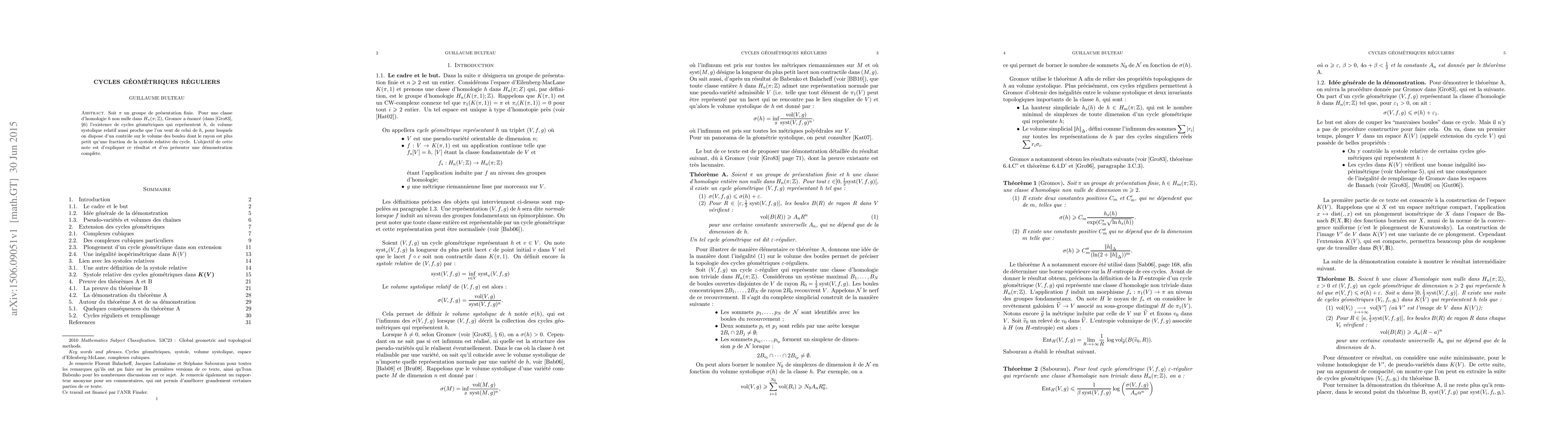Let $\pi$ be a finitely presented group. If h is a non trivial homology class in Hn($\pi$; Z), a theorem of Gromov (see [Gro83], 6) asserts the existence of regular geometric cycles which represent h, whose relative systolic volume is as close as desired to the systolic volume of h, in which we can control the volume of balls of radius less than half of the cycle's relative systol. The aim of this note is to explain and provide a complete proof of this result.