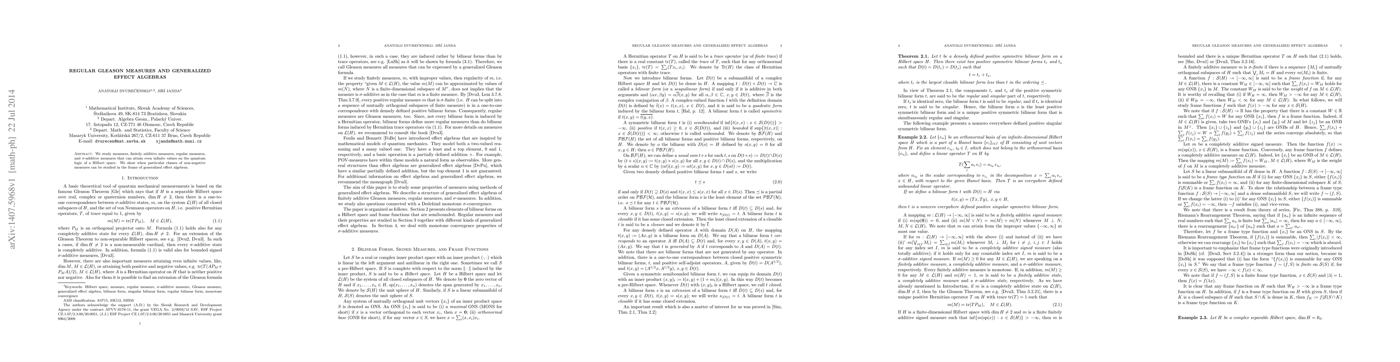 The paper studies measures, finitely additive measures, regular measures, and σ-additive measures on the quantum logic of a Hilbert space, linking them to generalized effect algebras.