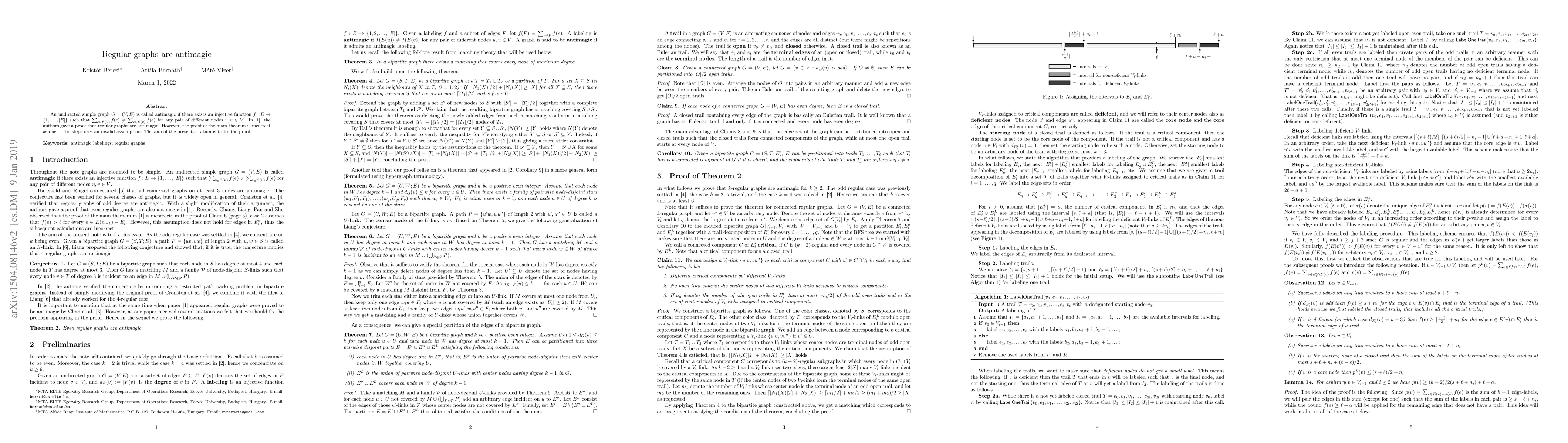 The paper provides a corrected proof for the antimagic property of regular graphs, utilizing advanced graph theory concepts and theorems.