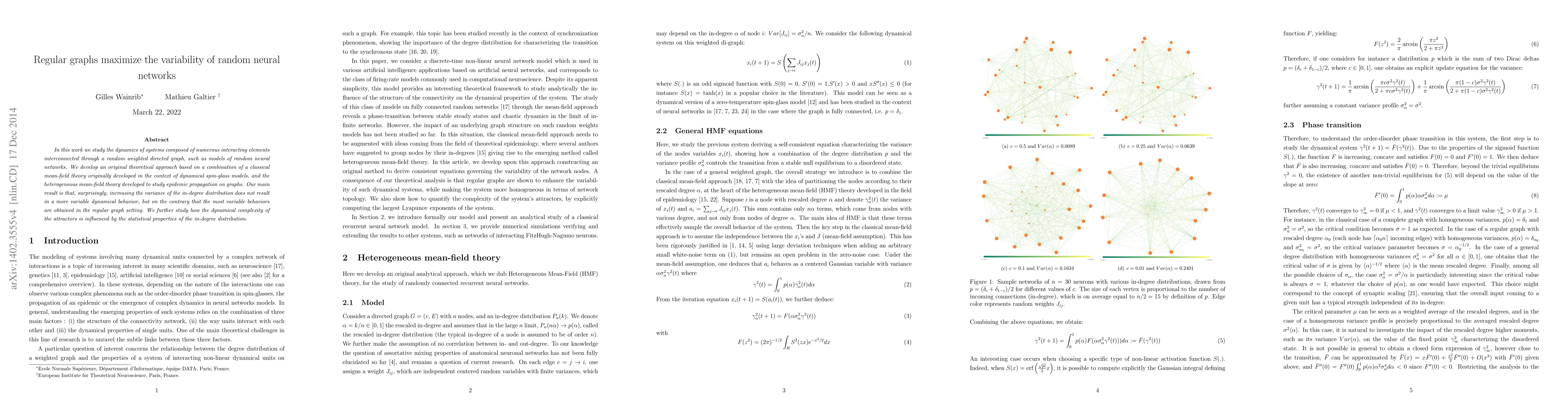 In this work we study the dynamics of systems composed of numerous interacting elements interconnected through a random weighted directed graph, such as models of random neural networks. We develop an original theoretical approach based on a combination of a classical mean-field theory originally developed in the context of dynamical spin-glass models, and the heterogeneous mean-field theory developed to study epidemic propagation on graphs. Our main result is that, surprisingly, increasing the variance of the in-degree distribution does not result in a more variable dynamical behavior, but on the contrary that the most variable behaviors are obtained in the regular graph setting. We further study how the dynamical complexity of the attractors is influenced by the statistical properties of the in-degree distribution.