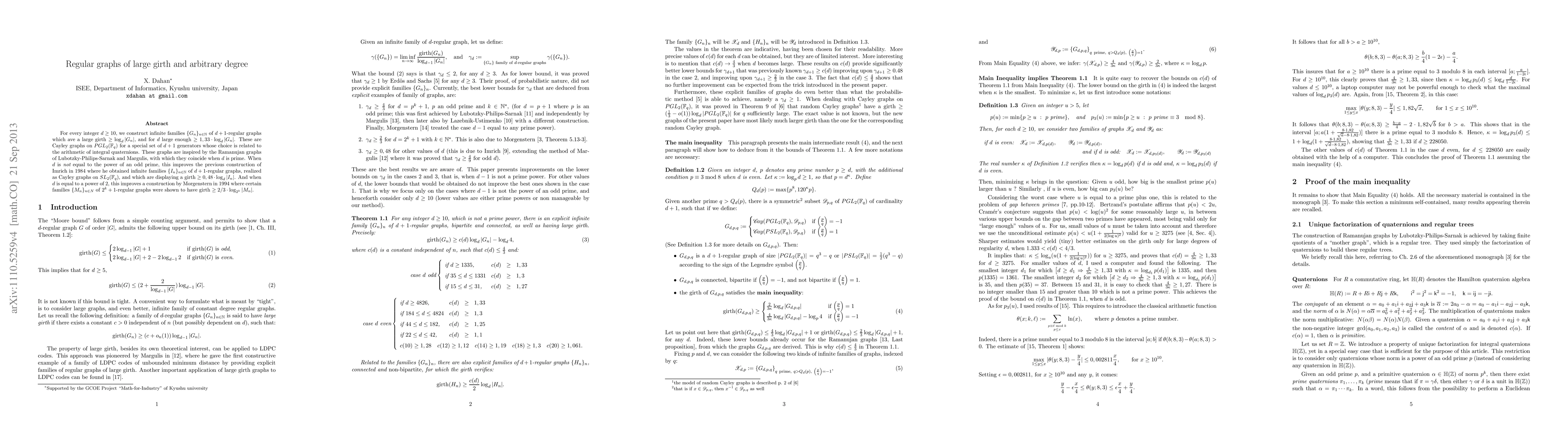The research constructs infinite families of (d+1)-regular graphs with large girth > log_d |G_n| for d > 9, using Cayley graphs on PGL_2(q) for a specific set of d+1 generators related to integral quaternion arithmetic. These graphs improve upon previous constructions for non-prime power degrees and coincide with Ramanujan graphs when d is prime.