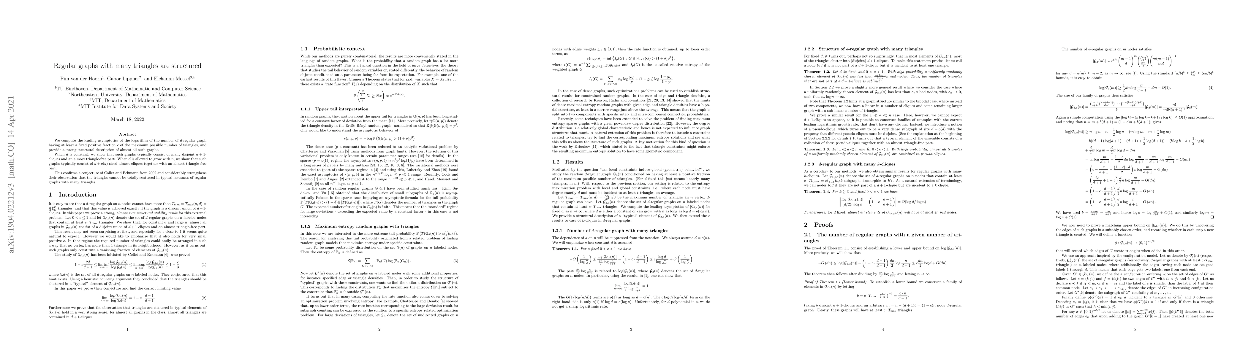 This paper investigates the number of triangles in large $d$-regular graphs, showing that those with a significant number of triangles typically contain many disjoint $d+1$-cliques and an almost triangle-free part. It confirms a conjecture from 2002 that such graphs cannot have triangles totally scattered.