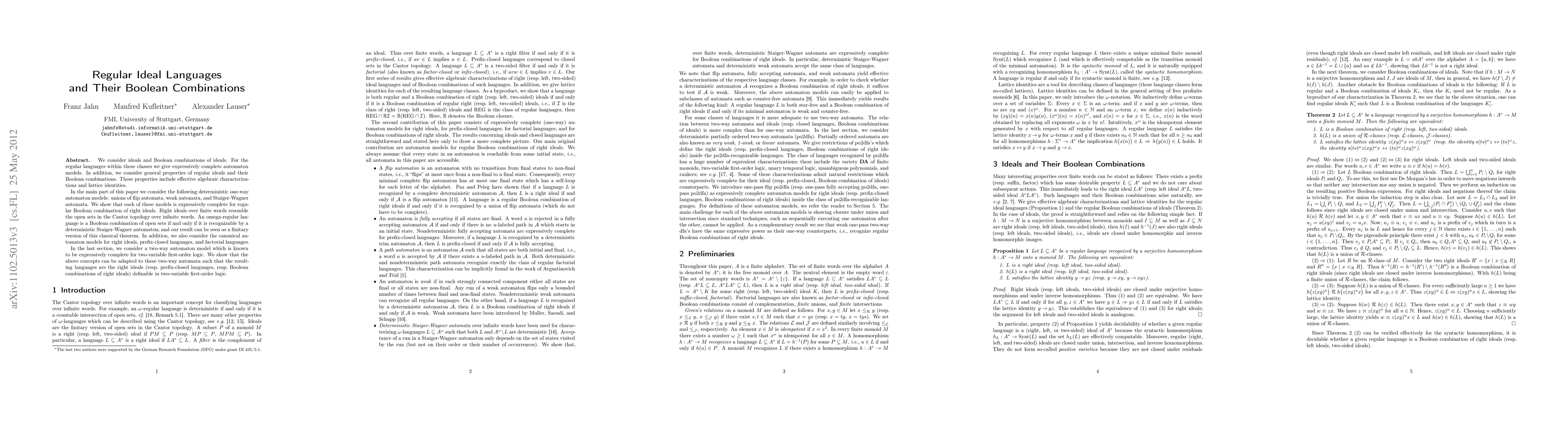 This paper explores regular ideal languages and their Boolean combinations, providing complete automaton models for these languages. It demonstrates the expressive completeness of various deterministic automaton models for regular Boolean combinations of right ideals and extends these concepts to two-way automata for two-variable first-order logic.