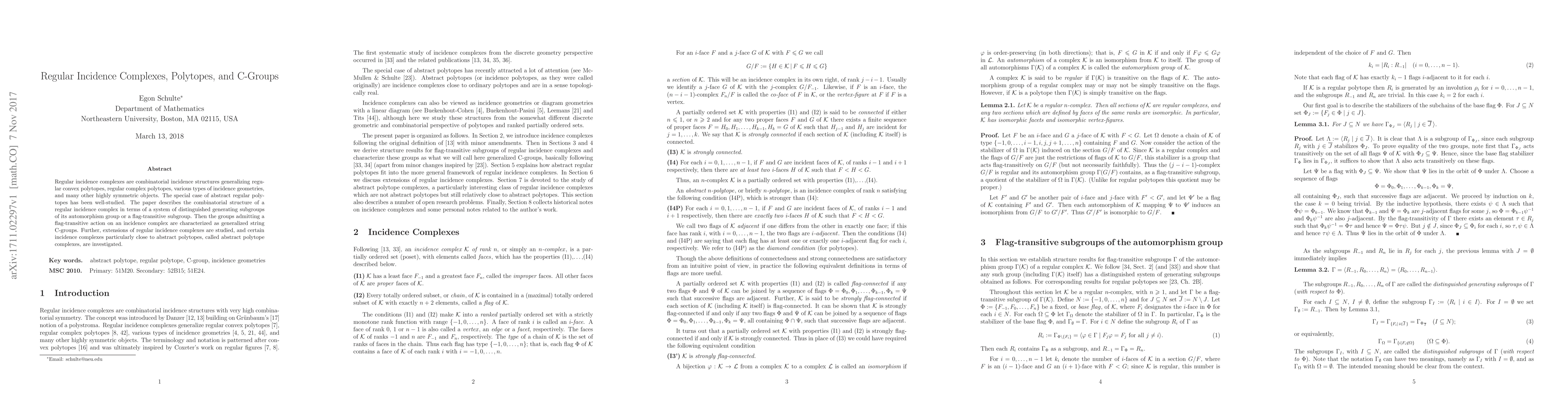 Regular incidence complexes are combinatorial incidence structures generalizing regular convex polytopes, regular complex polytopes, various types of incidence geometries, and many other highly symmetric objects. The special case of abstract regular polytopes has been well-studied. The paper describes the combinatorial structure of a regular incidence complex in terms of a system of distinguished generating subgroups of its automorphism group or a flag-transitive subgroup. Then the groups admitting a flag-transitive action on an incidence complex are characterized as generalized string C-groups. Further, extensions of regular incidence complexes are studied, and certain incidence complexes particularly close to abstract polytopes, called abstract polytope complexes, are investigated.