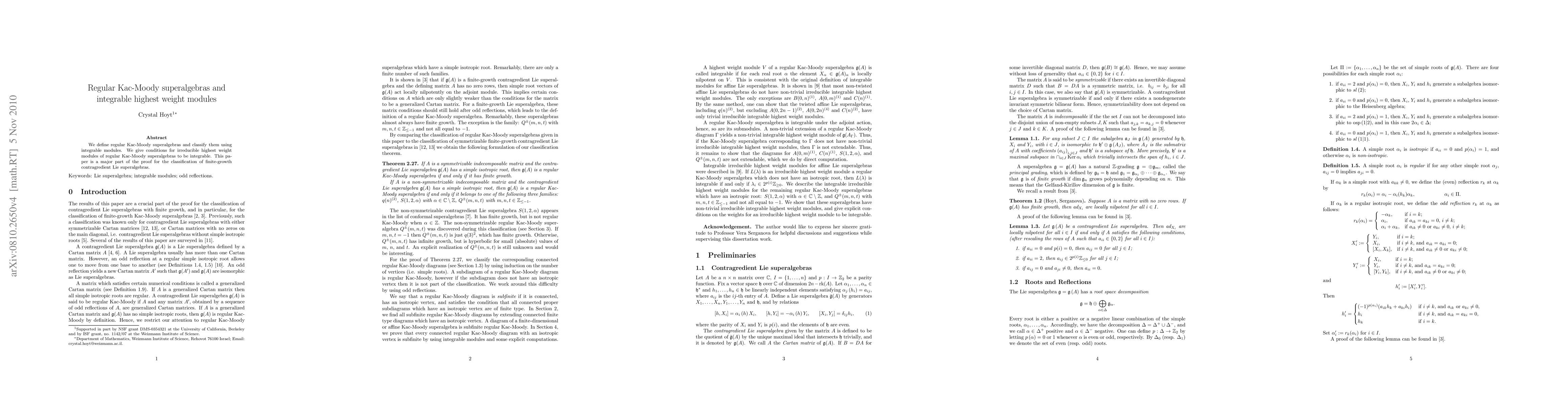 This paper defines and classifies regular Kac-Moody superalgebras through integrable highest weight modules, providing conditions for the integrability of irreducible highest weight modules, contributing to the classification of finite-growth contragredient Lie superalgebras.