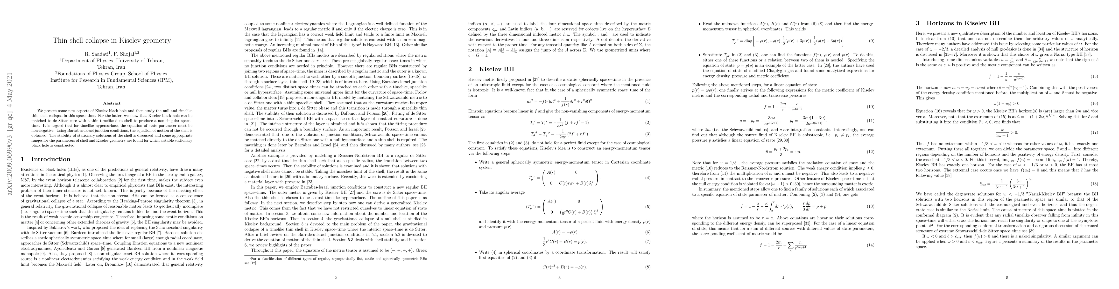 We present some new aspects of Kiselev black hole and then study the null and timelike thin shell collapse in this spacetime. For the latter, we show that Kiselev black hole can be matched to de Sitter core with a thin timelike dust shell to produce a non-singular black hole space-time. It is argued that for timelike hypersurface, the equation of state parameter must be non-negative. Using Barrabes-Israel junction conditions, the equation of motion of the shell is obtained. The stability of stationary solutions of the shell is discussed and some appropriate ranges for the parameters of shell and Kiselev geometry are found for which a stable stationary black hole is constructed.