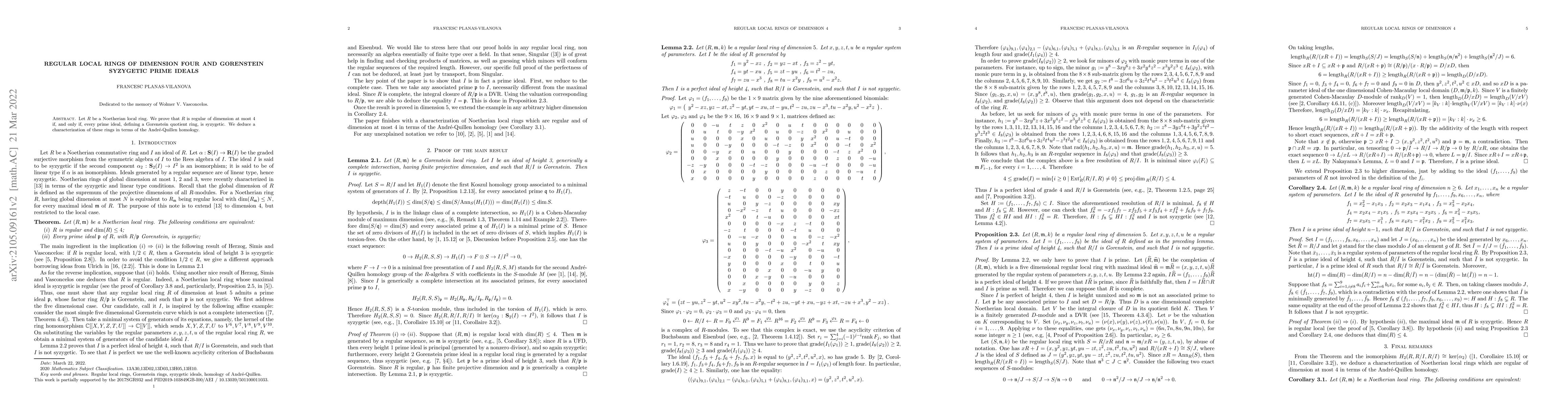 Let $R$ be a Noetherian local ring. We prove that $R$ is regular of dimension at most four if, and only if, every prime ideal, defining a Gorenstein quotient ring, is syzygetic. We deduce a characterization of these rings in terms of the Andr\'e-Quillen homology.