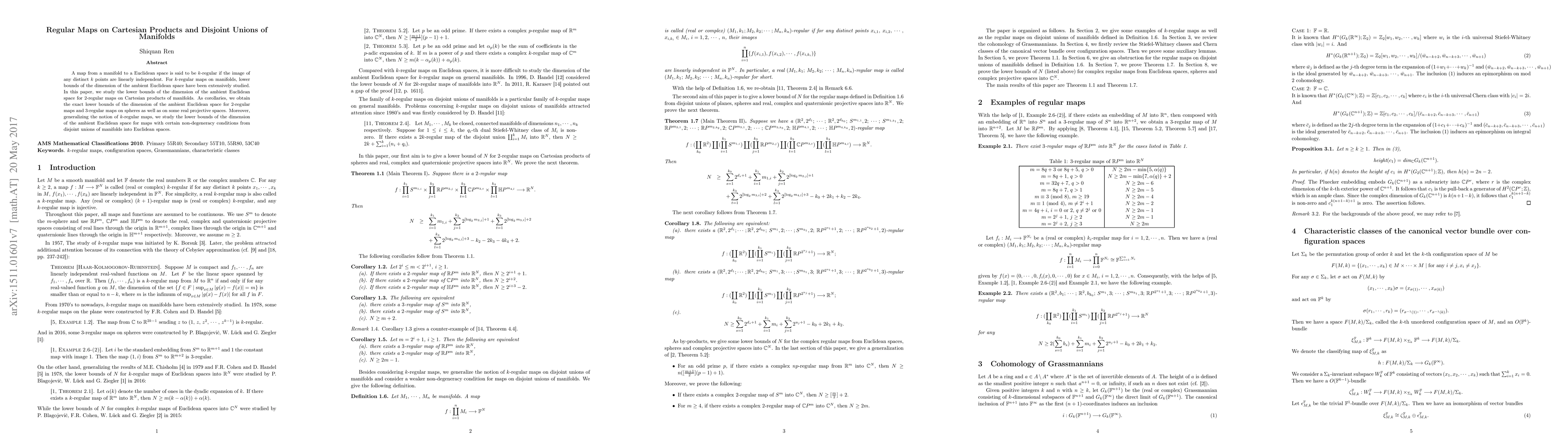 This paper investigates lower bounds for the dimension of Euclidean spaces that can accommodate 2-regular maps on Cartesian products of manifolds, deriving exact bounds for 2-regular maps on spheres and 3-regular maps on real projective spaces. It also extends the concept of k-regular maps to non-degenerate maps from disjoint unions of manifolds into Euclidean spaces.