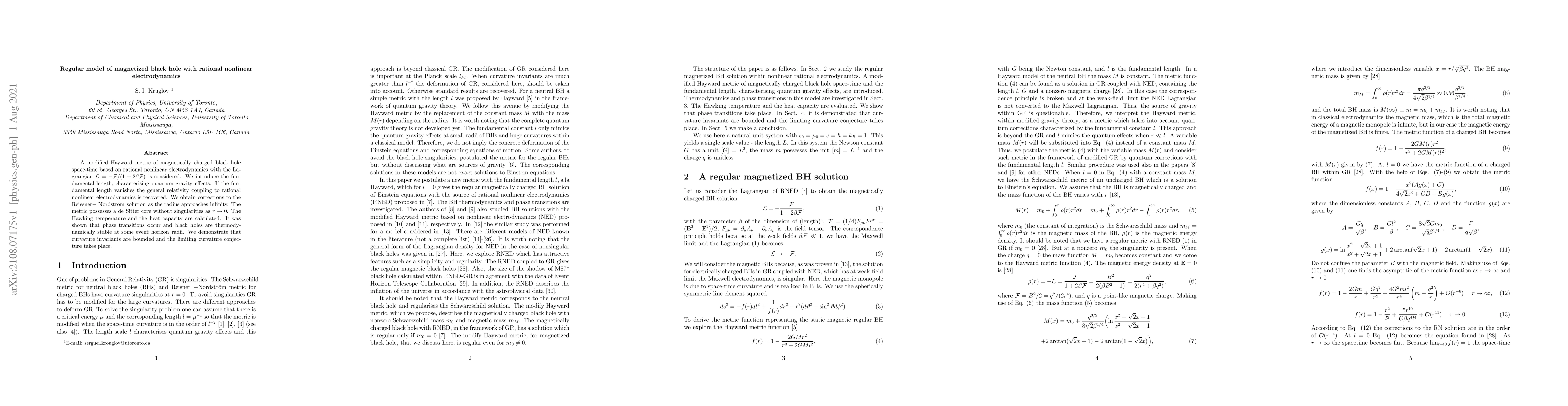 A modified Hayward metric of magnetically charged black hole space-time based on rational nonlinear electrodynamics with the Lagrangian ${\cal L} = -{\cal F}/(1+2\beta{\cal F})$ is considered. We introduce the fundamental length, characterizing quantum gravity effects. If the fundamental length vanishes the general relativity coupling to rational nonlinear electrodynamics is recovered. We obtain corrections to the Reissner--Nordstr\"{o}m solution as the radius approaches infinity. The metric possesses a de Sitter core without singularities as $r\rightarrow 0$. The Hawking temperature and the heat capacity are calculated. It was shown that phase transitions occur and black holes are thermodynamically stable at some event horizon radii. We demonstrate that curvature invariants are bounded and the limiting curvature conjecture takes place.