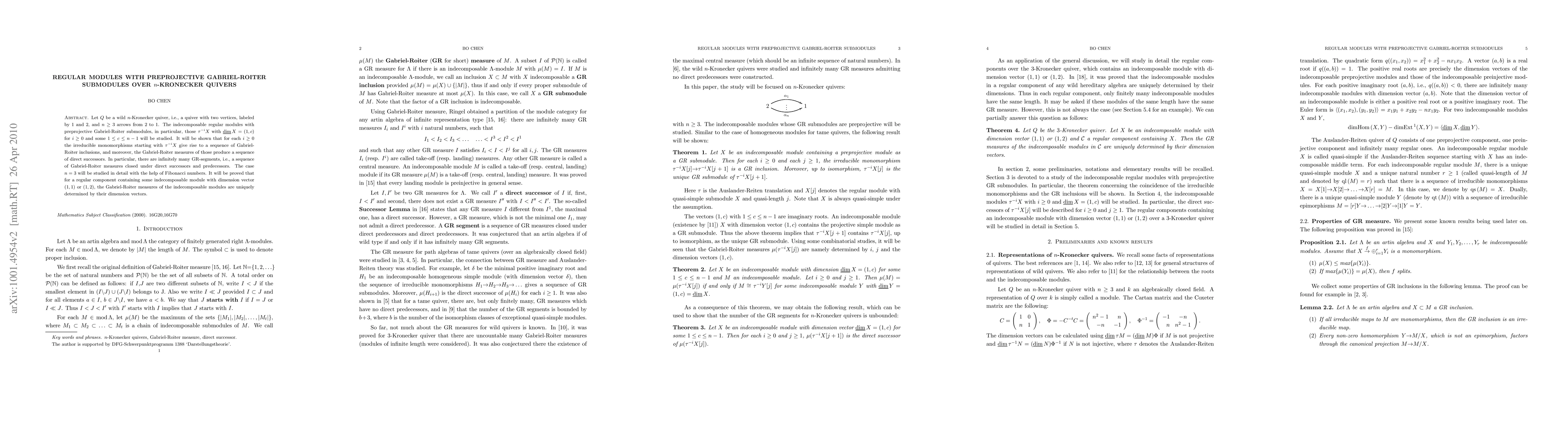 Let $Q$ be a wild $n$-Kronecker quiver, i.e., a quiver with two vertices, labeled by 1 and 2, and $n\geq 3$ arrows from 2 to 1. The indecomposable regular modules with preprojective Gabriel-Roiter submodules, in particular, those $\tau^{-i}X$ with $\udim X=(1,c)$ for $i\geq 0$ and some $1\leq c\leq n-1$ will be studied. It will be shown that for each $i\geq 0$ the irreducible monomorphisms starting with $\tau^{-i}X$ give rise to a sequence of Gabriel-Roiter inclusions, and moreover, the Gabriel-Roiter measures of those produce a sequence of direct successors. In particular, there are infinitely many GR-segments, i.e., a sequence of Gabriel-Roiter measures closed under direct successors and predecessors. The case $n=3$ will be studied in detail with the help of Fibonacci numbers. It will be proved that for a regular component containing some indecomposable module with dimension vector $(1,1)$ or $(1,2)$, the Gabriel-Roiter measures of the indecomposable modules are uniquely determined by their dimension vectors.