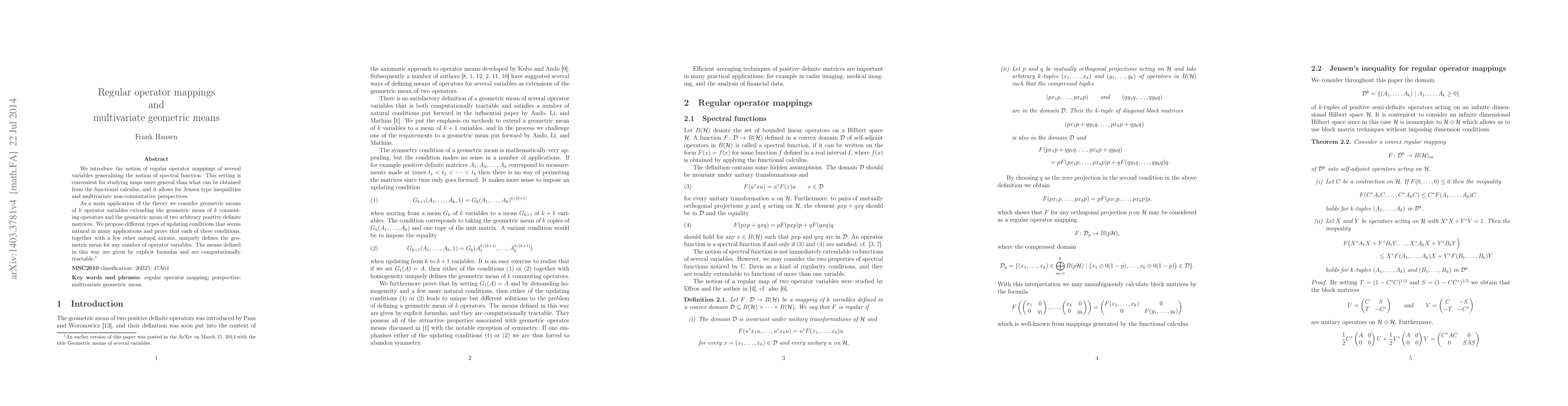 We introduce the notion of regular operator mappings of several variables generalising the notion of spectral function. This setting is convenient for studying maps more general than what can be obtained from the functional calculus, and it allows for Jensen type inequalities and multivariate non-commutative perspectives. As a main application of the theory we consider geometric means of k operator variables extending the geometric mean of k commuting operators and the geometric mean of two arbitrary positive definite matrices. We propose different types of updating conditions that seems natural in many applications and prove that each of these conditions, together with a few other natural axioms, uniquely defines the geometric mean for any number of operator variables. The means defined in this way are given by explicit formulas and are computationally tractable.