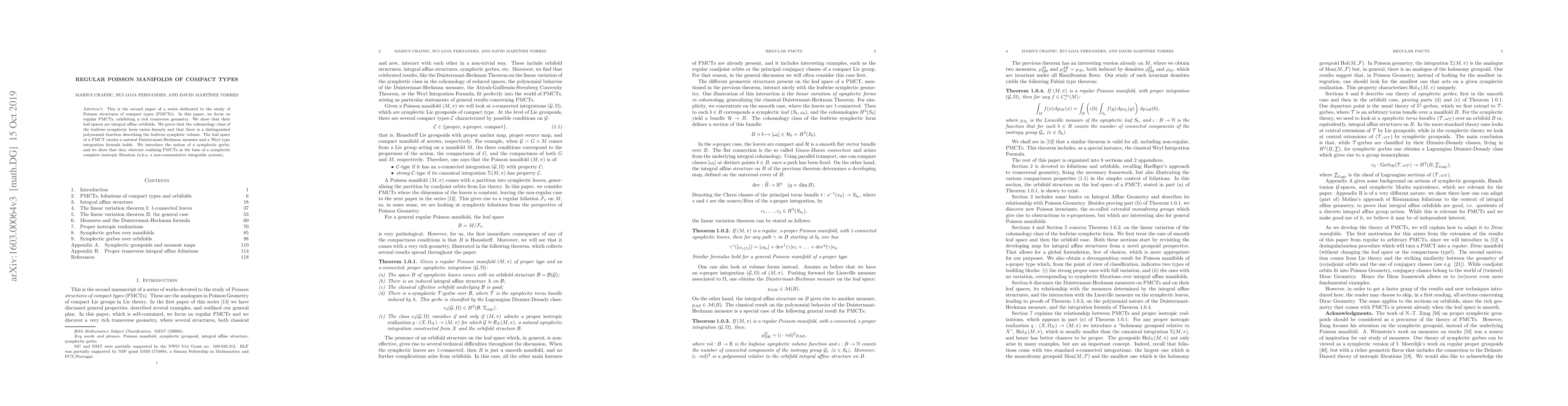 This research paper explores regular Poisson manifolds of compact types, showing that their leaf spaces are integral affine orbifolds with a natural Duistermaat-Heckman measure. The paper also introduces the concept of symplectic gerbes, which obstruct realizing these manifolds as the base of a symplectic complete isotropic fibration.