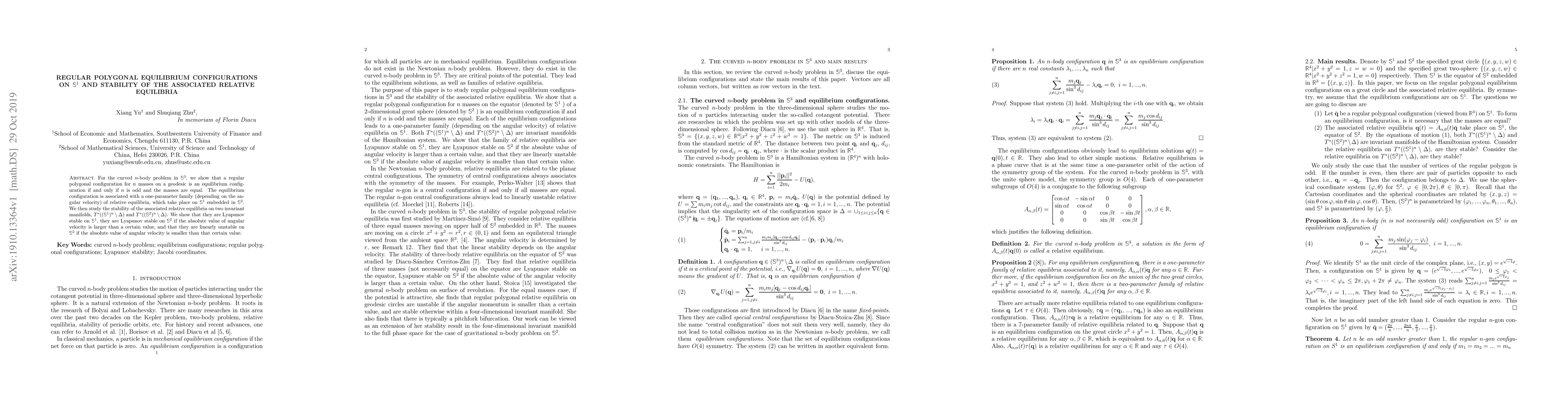 This paper investigates equilibrium configurations of n equal masses on a geodesic in S^3, proving they form an equilibrium only if n is odd. It also examines the stability of associated relative equilibria on S^1 and S^2, finding they are stable on S^1 and conditionally stable on S^2 depending on angular velocity.