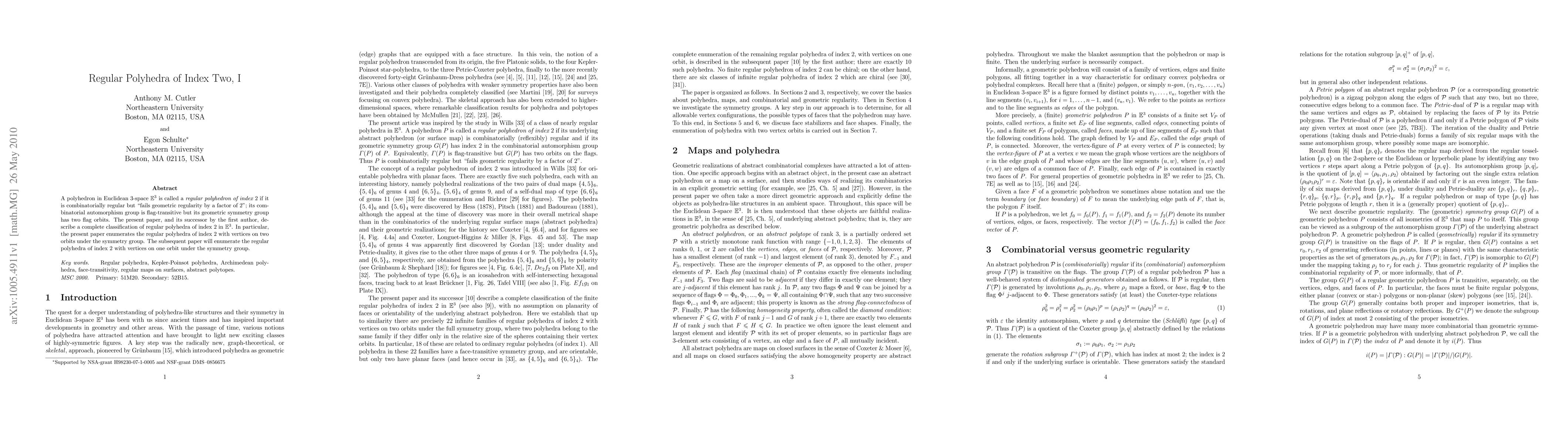 This paper classifies regular polyhedra of index 2 in 3-space, which are combinatorially regular but geometrically irregular by a factor of two. It enumerates polyhedra where the vertices lie on two distinct orbits under the symmetry group. A follow-up paper will cover those with vertices on a single orbit.