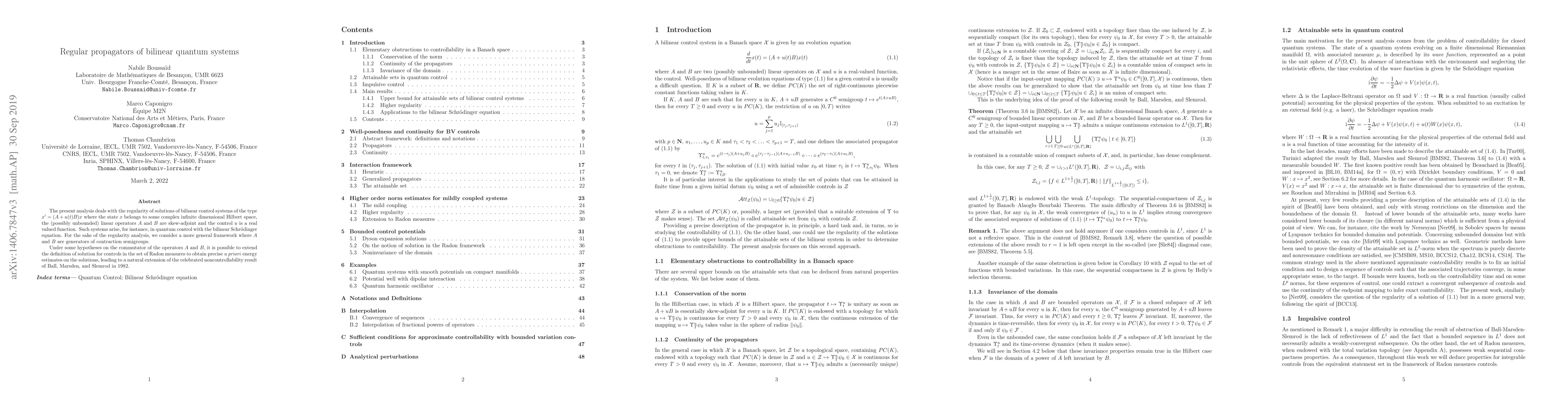 The present analysis deals with the regularity of solutions of bilinear control systems of the type $x'=(A+u(t)B)x$where the state $x$ belongs to some complex infinite dimensional Hilbert space, the (possibly unbounded) linear operators $A$ and $B$ are skew-adjoint and the control $u$ is a real valued function. Such systems arise, for instance, in quantum control with the bilinear Schr\"{o}dinger equation. For the sake of the regularity analysis, we consider a more general framework where $A$ and $B$ are generators of contraction semi-groups.Under some hypotheses on the commutator of the operators $A$ and $B$, it is possible to extend the definition of solution for controls in the set of Radon measures to obtain precise a priori energy estimates on the solutions, leading to a natural extension of the celebrated noncontrollability result of Ball, Marsden, and Slemrod in 1982. Complementary material to this analysis can be found in [hal-01537743v1]
