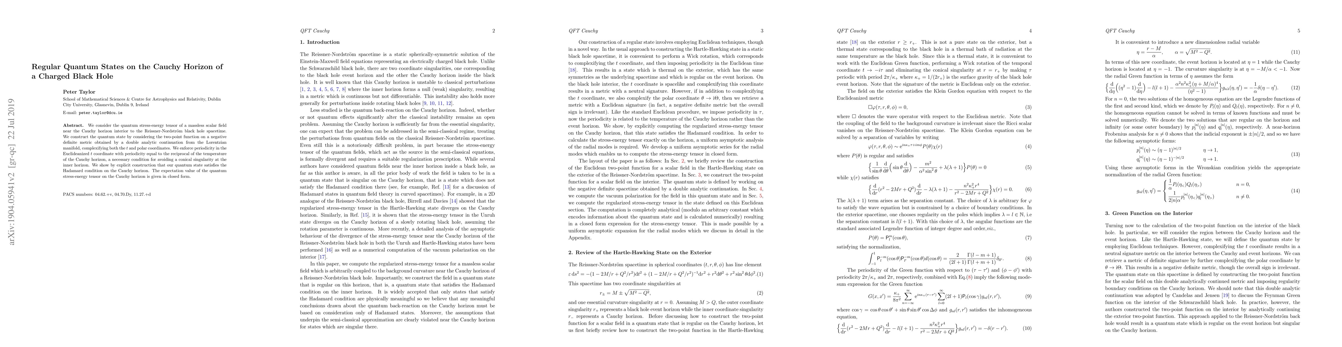 This paper constructs a regular quantum state for a massless scalar field near the Cauchy horizon of a Reissner-Nordström black hole by employing a double analytic continuation and enforcing periodicity in the Euclideanized time. The resulting quantum state satisfies the Hadamard condition and provides a closed-form expression for the expectation value of the quantum stress-energy tensor on the Cauchy horizon.