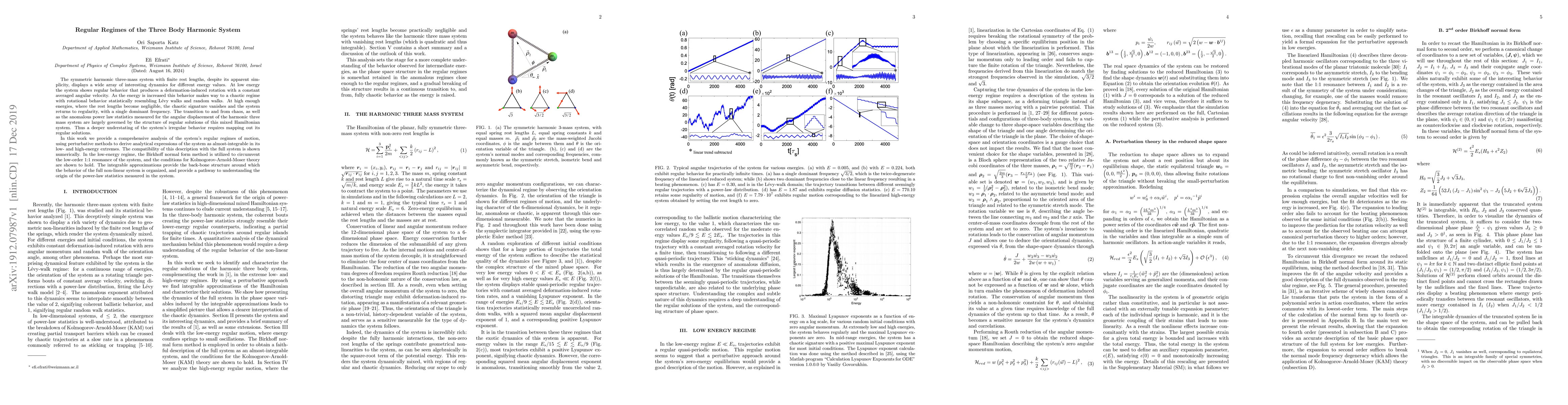 The symmetric harmonic three-mass system with finite rest lengths, despite its apparent simplicity, displays a wide array of interesting dynamics for different energy values. At low energy the system shows regular behavior that produces a deformation-induced rotation with a constant averaged angular velocity. As the energy is increased this behavior makes way to a chaotic regime with rotational behavior statistically resembling L\'evy walks and random walks. At high enough energies, where the rest lengths become negligible, the chaotic signature vanishes and the system returns to regularity, with a single dominant frequency. The transition to and from chaos, as well as the anomalous power law statistics measured for the angular displacement of the harmonic three mass system are largely governed by the structure of regular solutions of this mixed Hamiltonian system. Thus a deeper understating of the system's irregular behavior requires mapping out its regular solutions. In this work we provide a comprehensive analysis of the system's regular regimes of motion, using perturbative methods to derive analytical expressions of the system as almost-integrable in its low- and high-energy extremes. The compatibility of this description with the full system is shown numerically. In the low-energy regime, the Birkhoff normal form method is utilized to circumvent the low-order 1:1 resonance of the system, and the conditions for Kolmogorov-Arnold-Moser theory are shown to hold. The integrable approximations provide the back-bone structure around which the behavior of the full non-linear system is organized, and provide a pathway to understanding the origin of the power-law statistics measured in the system.