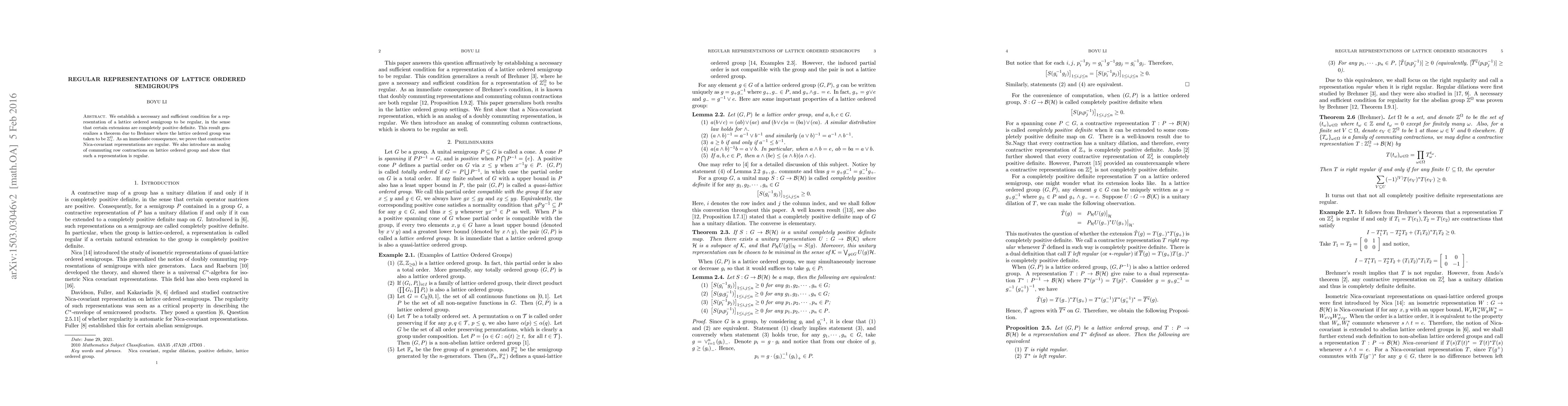 We establish a necessary and sufficient condition for a representation of a lattice ordered semigroup to be regular, in the sense that certain extensions are completely positive definite. This result generalizes a theorem due to Brehmer where the lattice ordered group was taken to be $\mathbb{Z}_+^\Omega$. As an immediate consequence, we prove that contractive Nica-covariant representations on lattice ordered semigroups are regular, and therefore, its minimal isometric dilation is also Nica-covariant. We also introduce an analog of commuting row contractions on lattice ordered group and show that such a representation is regular.