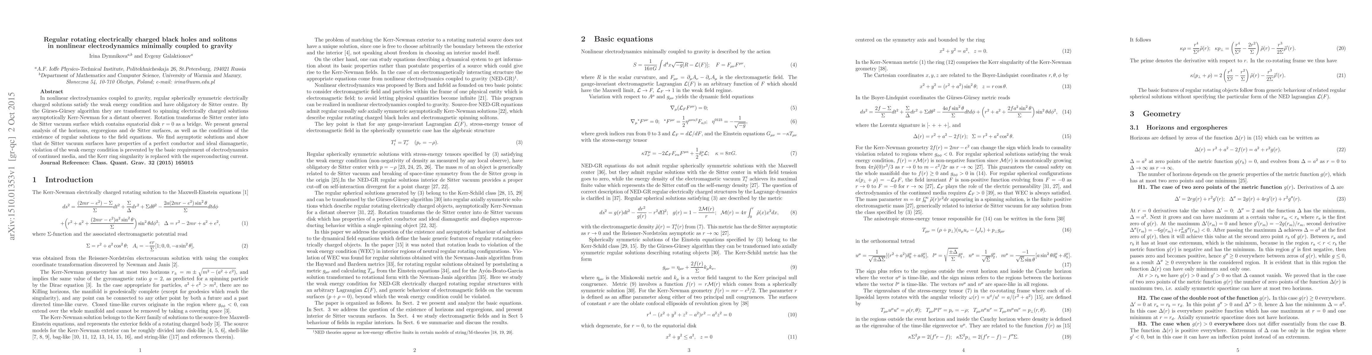 In nonlinear electrodynamics coupled to gravity, regular spherically symmetric electrically charged solutions satisfy the weak energy condition and have obligatory de Sitter centre. By the G\"urses-G\"ursey algorithm they are transformed to spinning electrically charged solutions asymptotically Kerr-Newman for a distant observer. Rotation transforms de Sitter center into de Sitter vacuum surface which contains equatorial disk $r=0$ as a bridge. We present general analysis of the horizons, ergoregions and de Sitter surfaces, as well as the conditions of the existence of regular solutions to the field equations. We find asymptotic solutions and show that de Sitter vacuum surfaces have properties of a perfect conductor and ideal diamagnetic, violation of the weak energy condition is prevented by the basic requirement of electrodynamics of continued media, and the Kerr ring singularity is replaced with the superconducting current.