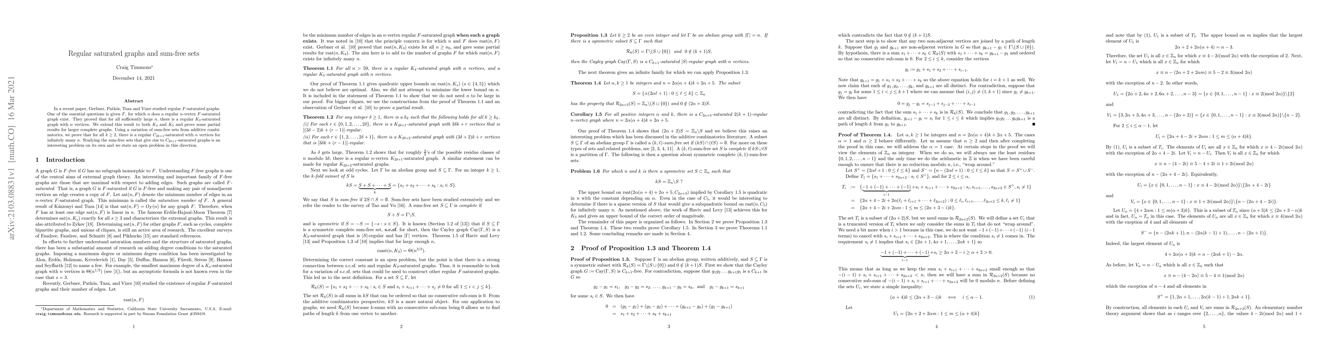 This paper extends the existence of regular $F$-saturated graphs for $K_4$, $K_5$, and larger complete graphs, proving that for all $k \geq 2$, there are infinitely many $n$ for which a regular $C_{2k+1}$-saturated graph exists. It also poses an open problem regarding the study of sum-free sets that generate these saturated graphs.