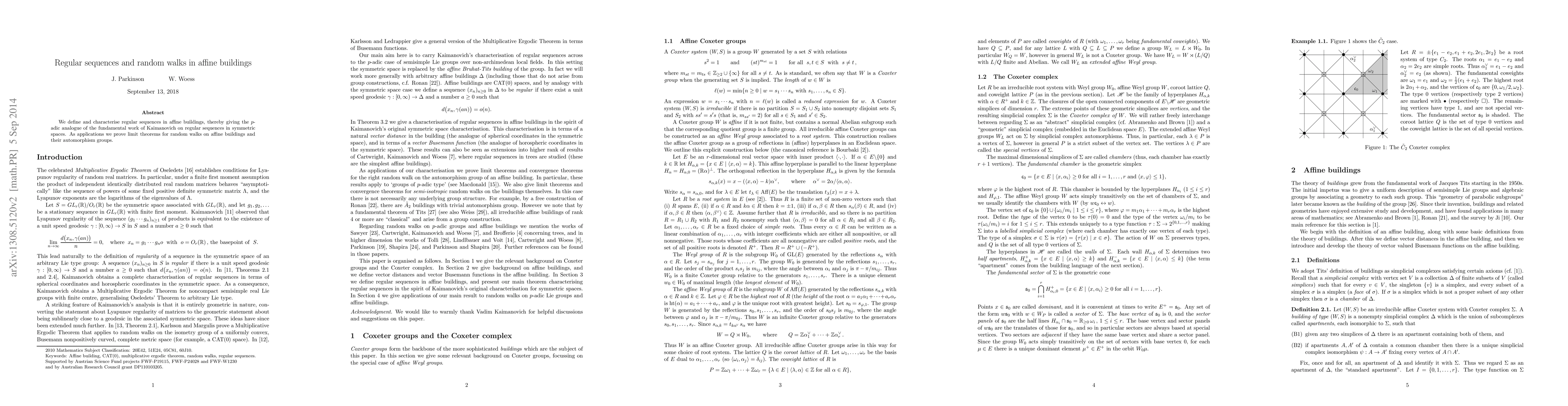 The paper introduces a novel definition and characterization of regular sequences in affine buildings, along with a comprehensive analysis of random walks on these structures in the p-adic setting.