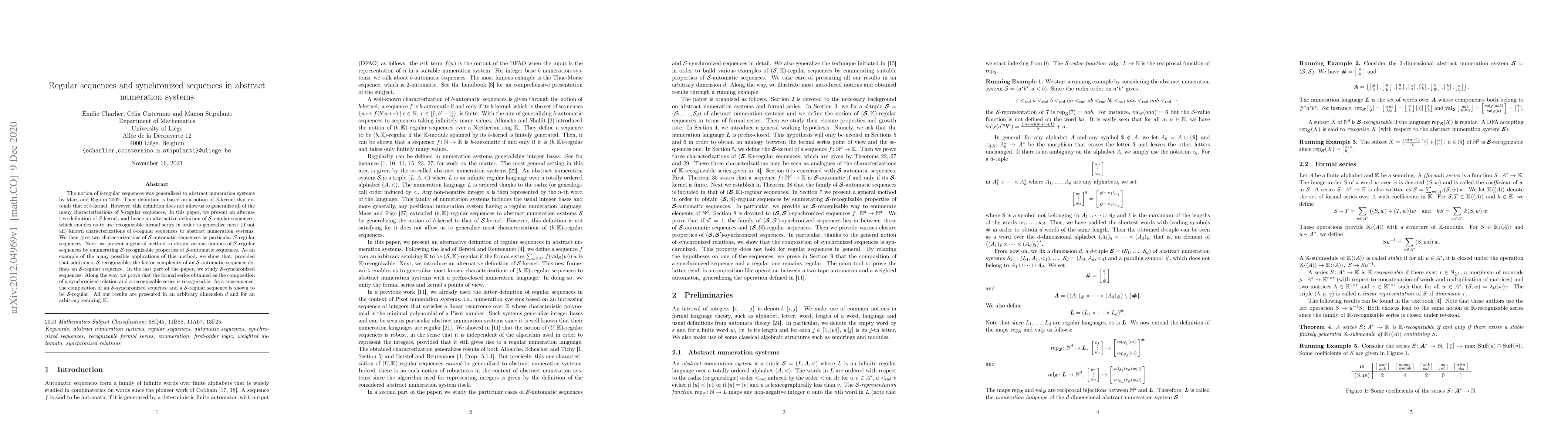 The notion of $b$-regular sequences was generalized to abstract numeration systems by Maes and Rigo in 2002. Their definition is based on a notion of $\mathcal{S}$-kernel that extends that of $b$-kernel. However, this definition does not allow us to generalize all of the many characterizations of $b$-regular sequences. In this paper, we present an alternative definition of $\mathcal{S}$-kernel, and hence an alternative definition of $\mathcal{S}$-regular sequences, which enables us to use recognizable formal series in order to generalize most (if not all) known characterizations of $b$-regular sequences to abstract numeration systems. We then give two characterizations of $\mathcal{S}$-automatic sequences as particular $\mathcal{S}$-regular sequences. Next, we present a general method to obtain various families of $\mathcal{S}$-regular sequences by enumerating $\mathcal{S}$-recognizable properties of $\mathcal{S}$-automatic sequences. As an example of the many possible applications of this method, we show that, provided that addition is $\mathcal{S}$-recognizable, the factor complexity of an $\mathcal{S}$-automatic sequence defines an $\mathcal{S}$-regular sequence. In the last part of the paper, we study $\mathcal{S}$-synchronized sequences. Along the way, we prove that the formal series obtained as the composition of a synchronized relation and a recognizable series is recognizable. As a consequence, the composition of an $\mathcal{S}$-synchronized sequence and a $\mathcal{S}$-regular sequence is shown to be $\mathcal{S}$-regular. All our results are presented in an arbitrary dimension $d$ and for an arbitrary semiring $\mathbb{K}$.