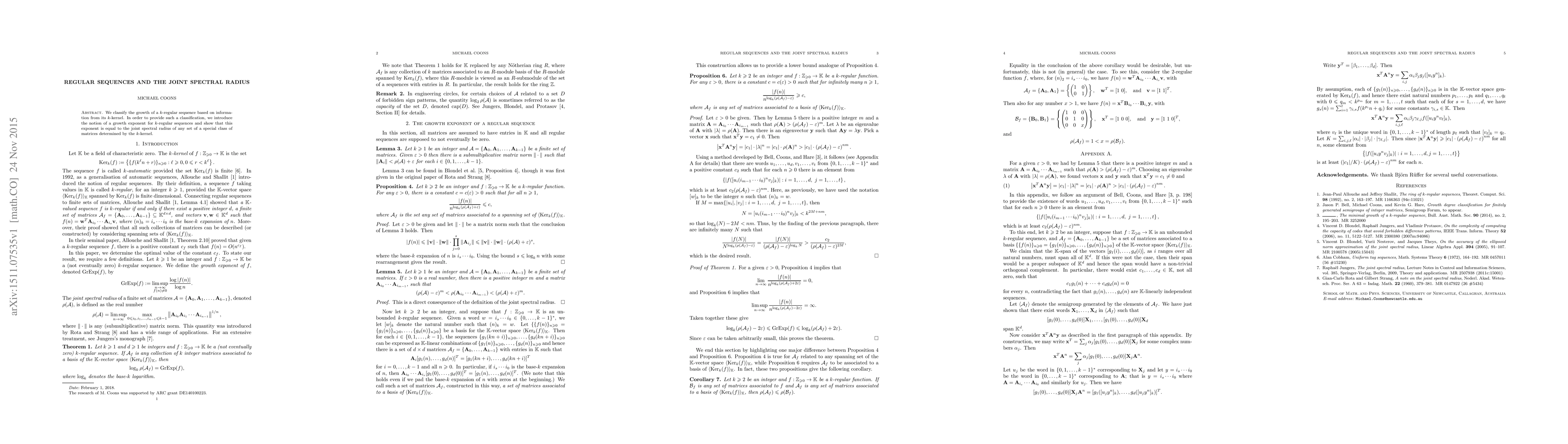 This paper classifies the growth of $k$-regular sequences using their $k$-kernel, introducing a growth exponent that equals the joint spectral radius of a specific class of matrices derived from the $k$-kernel. This establishes a connection between sequence growth and matrix spectral properties.