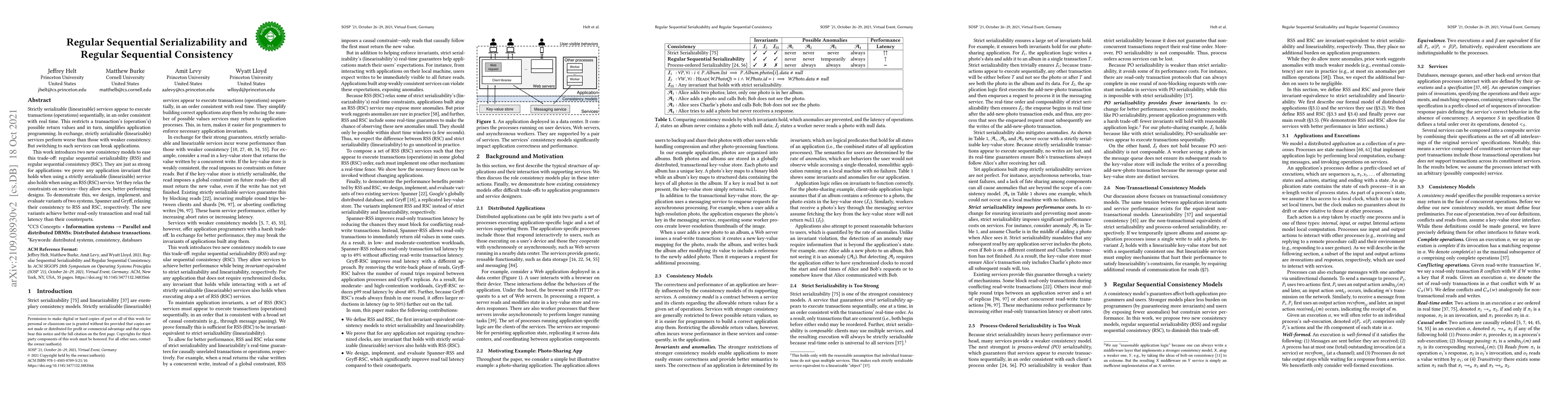 This paper introduces two new consistency models, regular sequential serializability (RSS) and regular sequential consistency (RSC), to balance the trade-off between performance and strict serializability in distributed systems. These models maintain application correctness while allowing for better-performing designs, demonstrated through improved read-only transaction and read tail latency in modified versions of Spanner and Gryff.