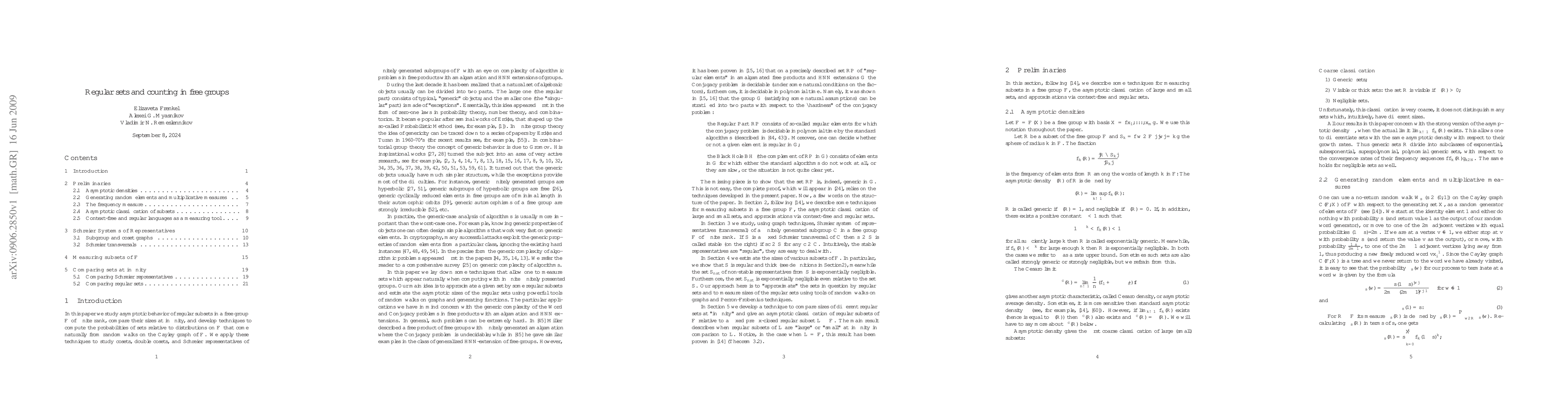 This paper studies the asymptotic behavior of regular subsets in free groups, developing techniques to compute probabilities of sets relative to distributions on the group's Cayley graph, with applications to cosets, double cosets, and Schreier representatives.