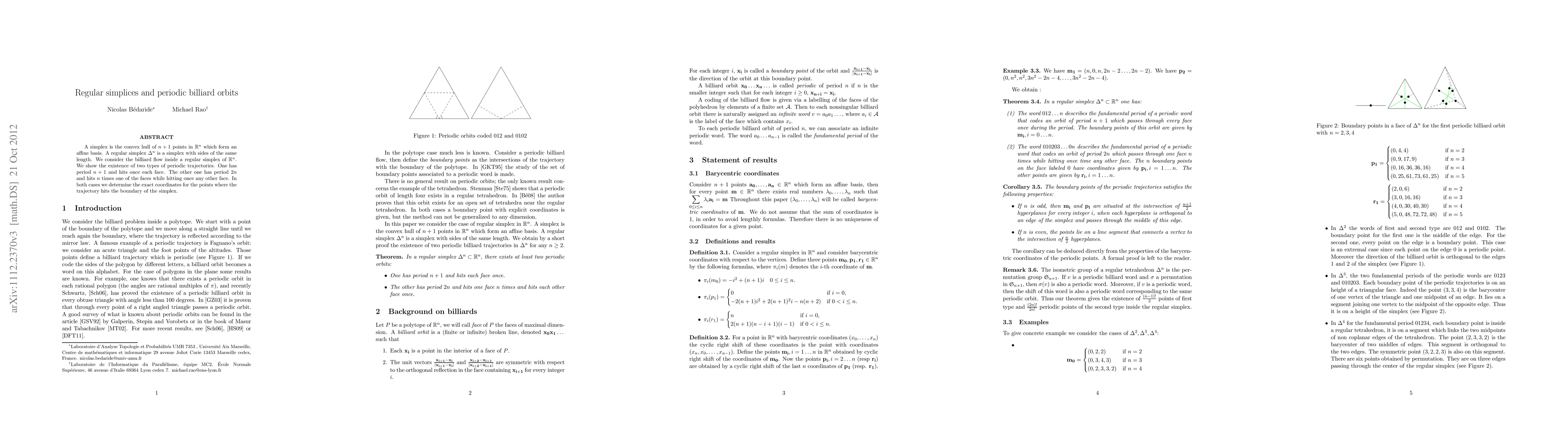 This paper investigates the billiard flow within a regular simplex in $\mathbb{R}^n$, demonstrating the existence of two periodic trajectories: one with period $n+1$ hitting each face once, and another with period $2n$ hitting one face $n$ times and any other face once. The exact coordinates of the trajectory boundary intersections are determined.