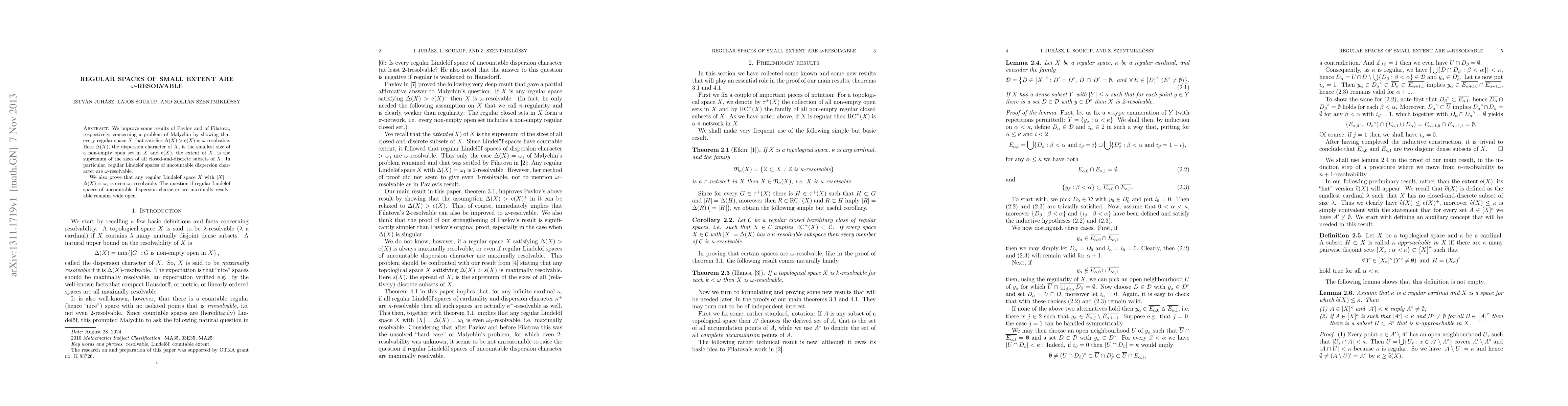 We improve some results of Pavlov and of Filatova, respectively, concerning a problem of Malychin by showing that every regular space X that satisfies Delta(X)>ext(X) is omega-resolvable. Here Delta(X), the dispersion character of X, is the smallest size of a non-empty open set in X and ext(X), the extent of X, is the supremum of the sizes of all closed-and-discrete subsets of X. In particular, regular Lindel\"of spaces of uncountable dispersion character are omega-resolvable. We also prove that any regular Lindel\"of space X with |X|=\Delta(X)=omega_1 is even omega_1-resolvable. The question if regular Lindel\"of spaces of uncountable dispersion character are maximally resolvable remains wide open.
