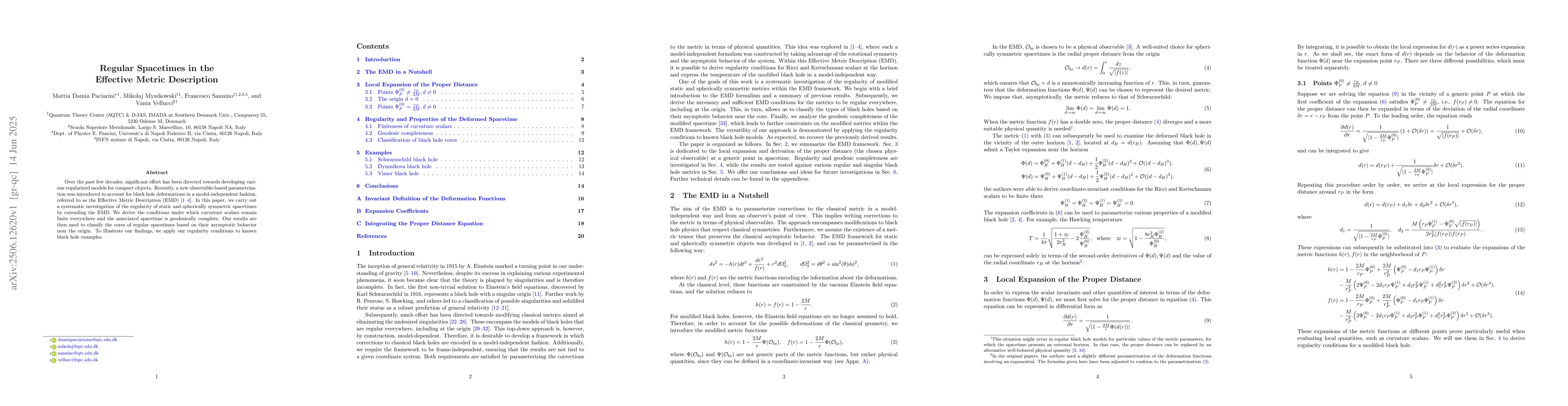 Over the past few decades, significant effort has been directed towards developing various regularized models for compact objects. Recently, a new observable-based parametrization was introduced to account for black hole deformations in a model-independent fashion, referred to as the Effective Metric Description (EMD) \cite{Binetti:2022xdi, DelPiano:2023fiw, DelPiano:2024gvw, DelPiano:2024nrl}. In this paper, we carry out a systematic investigation of the regularity of static and spherically symmetric spacetimes by extending the EMD. We derive the conditions under which curvature scalars remain finite everywhere and the associated spacetime is geodesically complete. Our results are then used to classify the cores of regular spacetimes based on their asymptotic behavior near the origin. To illustrate our findings, we apply our regularity conditions to known black hole examples.