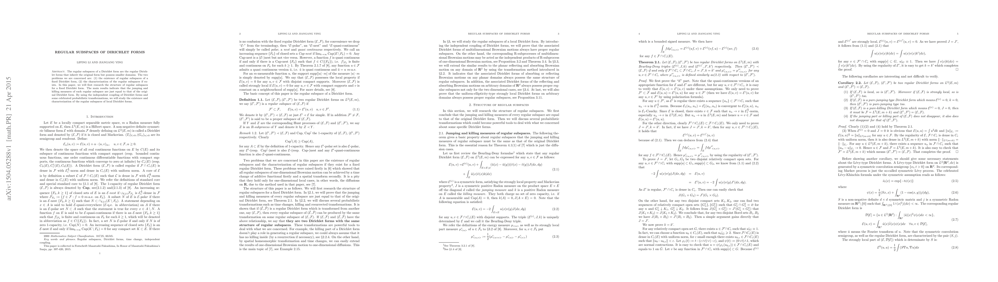 This paper investigates the existence and characterization of regular subspaces of Dirichlet forms, showing that their jumping and killing measures match those of the original form. It utilizes independent coupling and probabilistic transformations to explore these subspaces in the context of local Dirichlet forms.