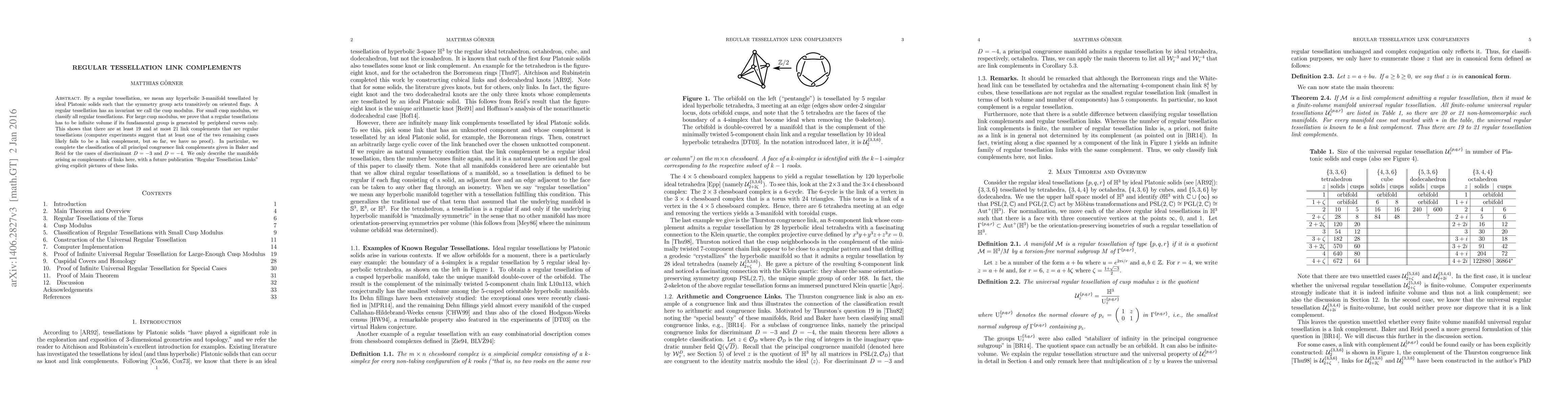 This paper classifies hyperbolic 3-manifolds formed by regular tessellations using ideal Platonic solids and examines their cusp moduli. It proves that large cusp modulus regular tessellations must be infinite volume and completes the classification of principal congruence link complements for discriminants D=-3 and D=-4.