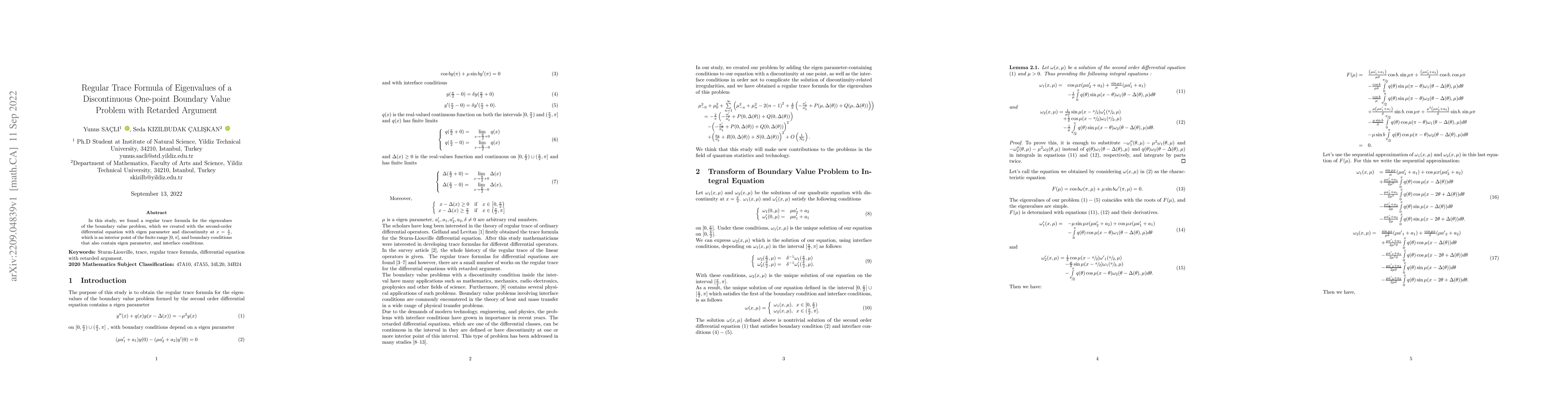 This paper derives a regular trace formula for eigenvalues of a second-order differential equation with a discontinuity at x=π/2, within the interval [0, π], and incorporates boundary and interface conditions dependent on the eigen parameter. The focus is on the eigenvalue problem with a retarded argument.