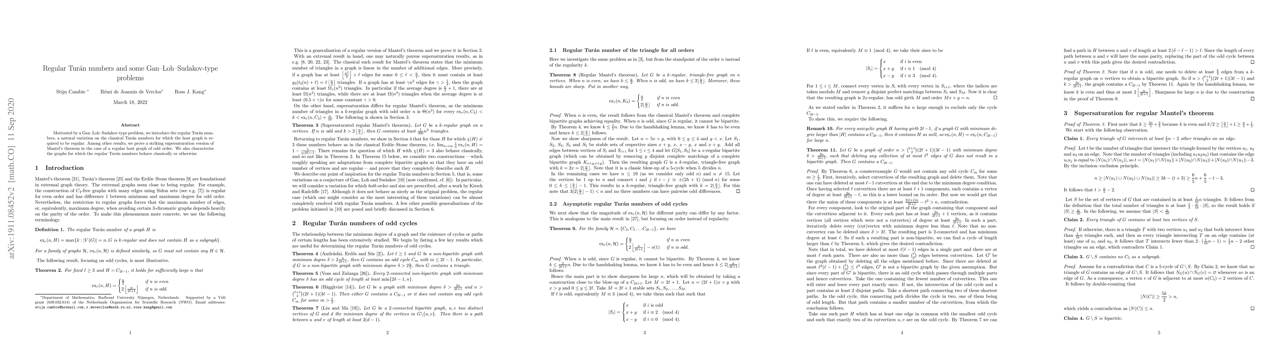 This paper introduces regular Tur\'an numbers, a variant of classical Tur\'an numbers where the host graph must be regular. It proves a supersaturation version of Mantel's theorem for regular host graphs of odd order and characterizes when these numbers behave classically.