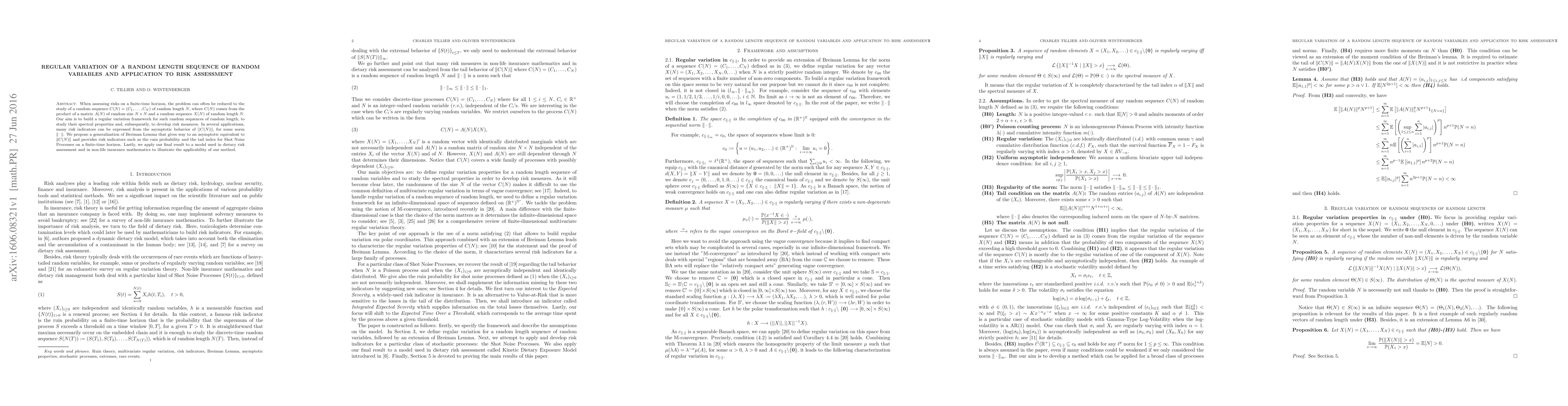 When assessing risks on a finite-time horizon, the problem can often be reduced to the study of a random sequence $C(N)=(C_1,\ldots,C_N)$ of random length $N$, where $C(N)$ comes from the product of a matrix $A(N)$ of random size $N \times N$ and a random sequence $X(N)$ of random length $N$. Our aim is to build a regular variation framework for such random sequences of random length, to study their spectral properties and, subsequently, to develop risk measures. In several applications, many risk indicators can be expressed from the asymptotic behavior of $\vert \vert C(N)\vert\vert$, for some norm $\Vert \cdot \Vert$. We propose a generalization of Breiman Lemma that gives way to an asymptotic equivalent to $\Vert C(N) \Vert$ and provides risk indicators such as the ruin probability and the tail index for Shot Noise Processes on a finite-time horizon. Lastly, we apply our final result to a model used in dietary risk assessment and in non-life insurance mathematics to illustrate the applicability of our method.