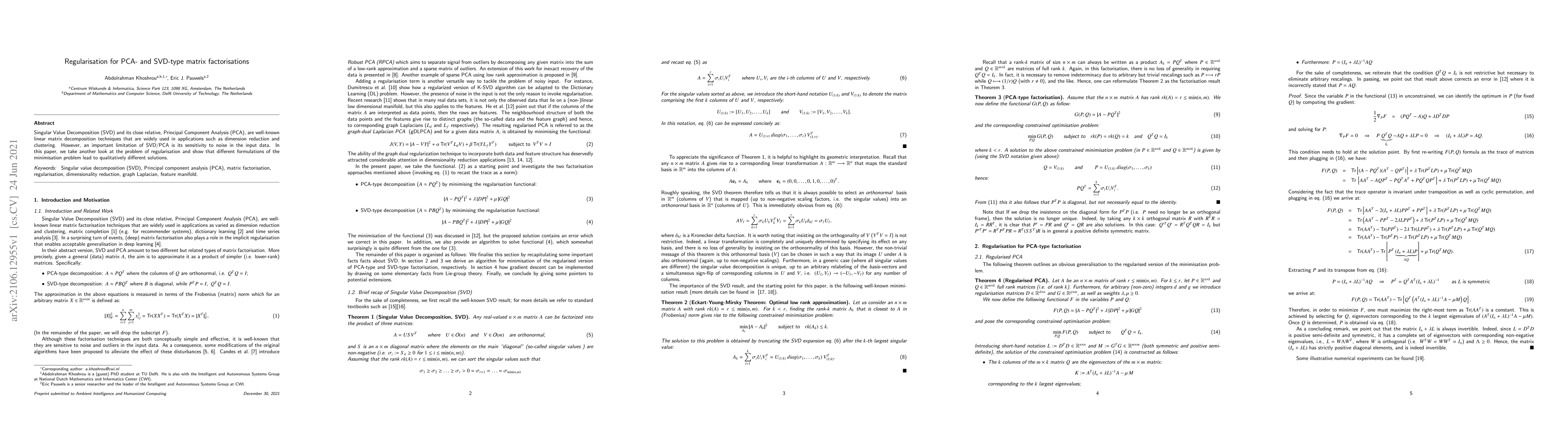 This paper investigates the regularisation of SVD and PCA to mitigate their sensitivity to noise in data. It demonstrates that various regularisation formulations yield distinct solutions, highlighting the importance of choosing the appropriate approach for specific applications.