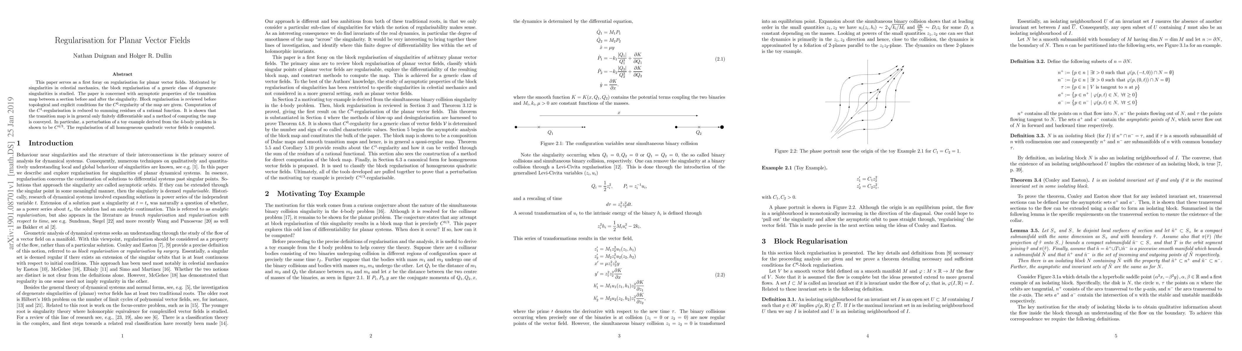This paper explores block regularisation techniques for planar vector fields, focusing on resolving singularities in celestial mechanics. It provides conditions for $C^0$-regularity and computes $C^1$-regularisation by summing residues, demonstrating that the transition map is typically only finitely differentiable.