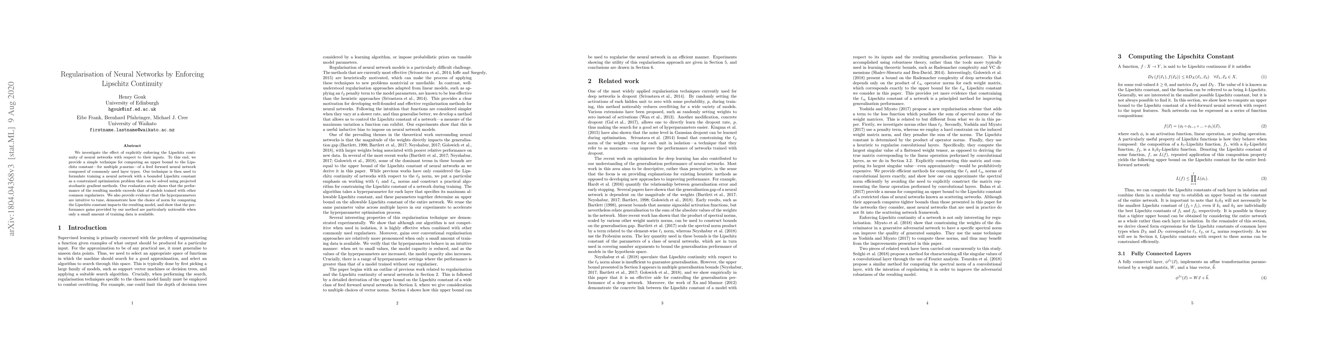 We investigate the effect of explicitly enforcing the Lipschitz continuity of neural networks with respect to their inputs. To this end, we provide a simple technique for computing an upper bound to the Lipschitz constant---for multiple $p$-norms---of a feed forward neural network composed of commonly used layer types. Our technique is then used to formulate training a neural network with a bounded Lipschitz constant as a constrained optimisation problem that can be solved using projected stochastic gradient methods. Our evaluation study shows that the performance of the resulting models exceeds that of models trained with other common regularisers. We also provide evidence that the hyperparameters are intuitive to tune, demonstrate how the choice of norm for computing the Lipschitz constant impacts the resulting model, and show that the performance gains provided by our method are particularly noticeable when only a small amount of training data is available.