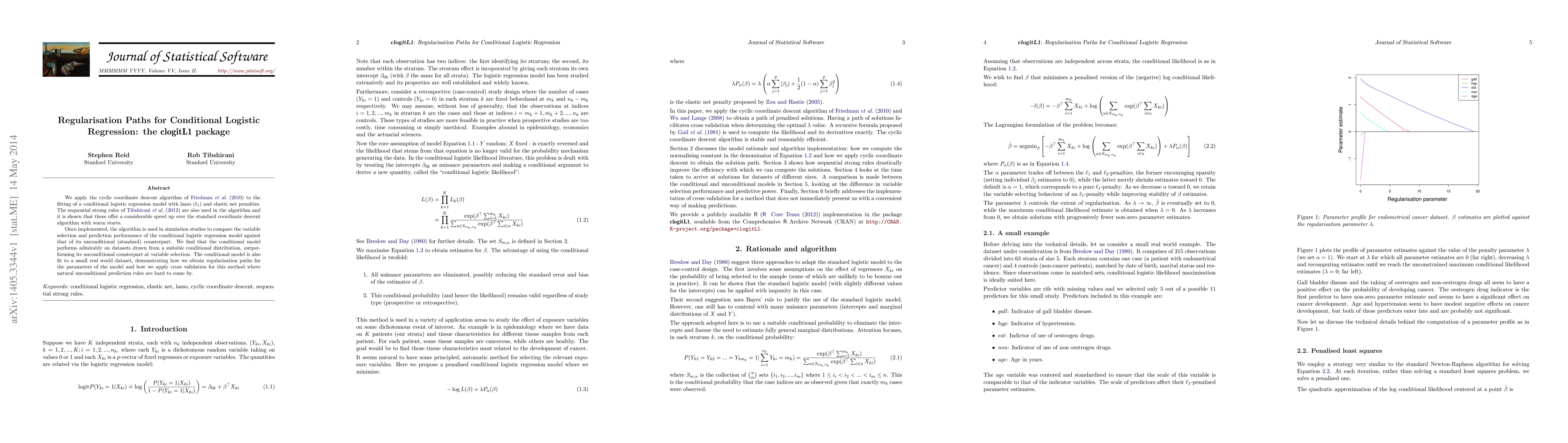 We apply the cyclic coordinate descent algorithm of Friedman, Hastie and Tibshirani (2010) to the fitting of a conditional logistic regression model with lasso ($\ell_1$) and elastic net penalties. The sequential strong rules of Tibshirani et al (2012) are also used in the algorithm and it is shown that these offer a considerable speed up over the standard coordinate descent algorithm with warm starts. Once implemented, the algorithm is used in simulation studies to compare the variable selection and prediction performance of the conditional logistic regression model against that of its unconditional (standard) counterpart. We find that the conditional model performs admirably on datasets drawn from a suitable conditional distribution, outperforming its unconditional counterpart at variable selection. The conditional model is also fit to a small real world dataset, demonstrating how we obtain regularisation paths for the parameters of the model and how we apply cross validation for this method where natural unconditional prediction rules are hard to come by.