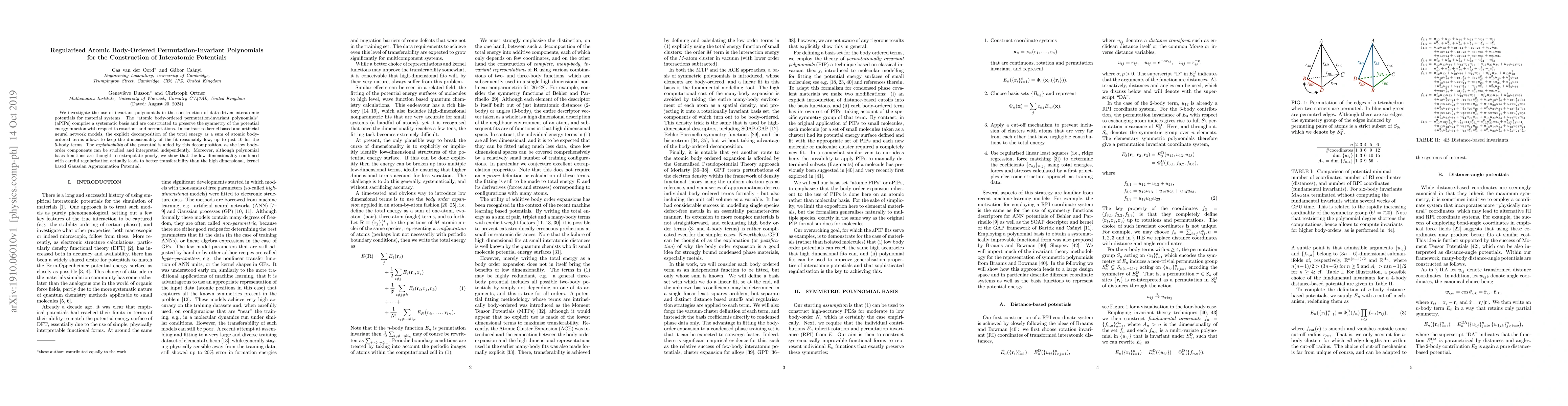 This paper explores the use of atomic body-ordered permutation-invariant polynomials (aPIPs) to construct data-driven interatomic potentials, maintaining symmetry and low dimensionality. The approach offers better transferability compared to high-dimensional kernel methods due to its regularised low-dimensional polynomial basis.
