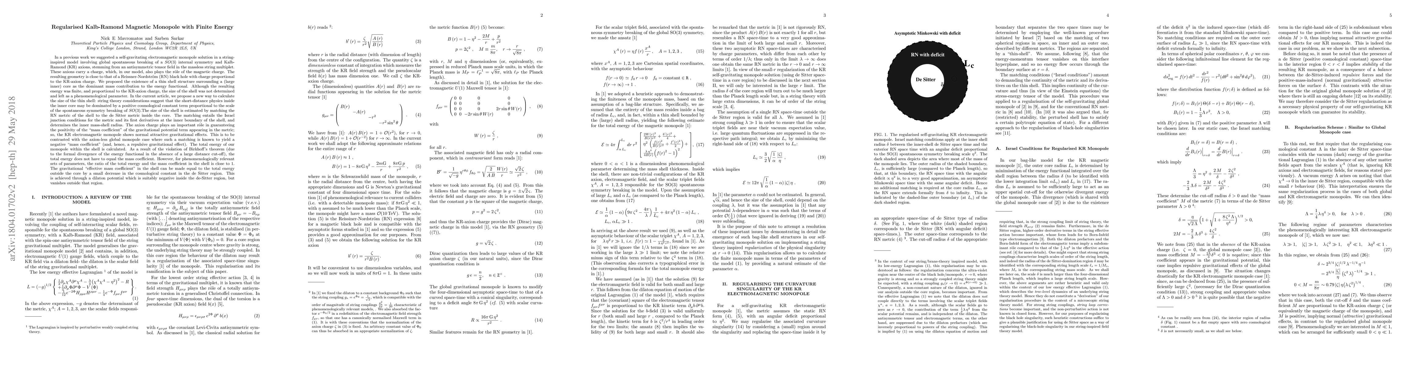 In a previous work we suggested a self-gravitating electromagnetic monopole solution in a string-inspired model involving global spontaneous breaking of a $SO(3)$ internal symmetry and Kalb-Ramond (KR) axions, stemming from an antisymmetric tensor field in the massless string multiplet. These axions carry a charge, which, in our model, also plays the r\^ole of the magnetic charge. The resulting geometry is close to that of a Reissner-Nordstr\"om (RN) black hole with charge proportional to the KR-axion charge. We proposed the existence of a thin shell structure inside a (large) core radius as the dominant mass contribution to the energy functional. The resulting energy was finite, and proportional to the KR-axion charge; however, the size of the shell was not determined and left as a phenomenological parameter. In the current article, we can calculate the mass-shell size, on proposing a regularisation of the black hole singularity via a matching procedure between the RN metric in the outer region and, in the inner region, a de Sitter space with a (positive) cosmological constant proportional to the scale of the spontaneous symmetry breaking of $SO(3)$ . The matching, which involves the Israel junction conditions for the metric and its first derivatives at the inner surface of the shell, determines the inner mass-shell radius. The axion charge plays an important r\^ole in guaranteeing positivity of the "mass coefficient" of the gravitational potential term appearing in the metric component; so the KR electromagnetic monopole shows normal attractive gravitational effects. This is to be contrasted with the global monopole case (in the absence of KR axions) where such a matching is known to yield a negative "mass coefficient" (and, hence, repulsive gravitational effects). The total energy of the monopole within the shell is calculated.