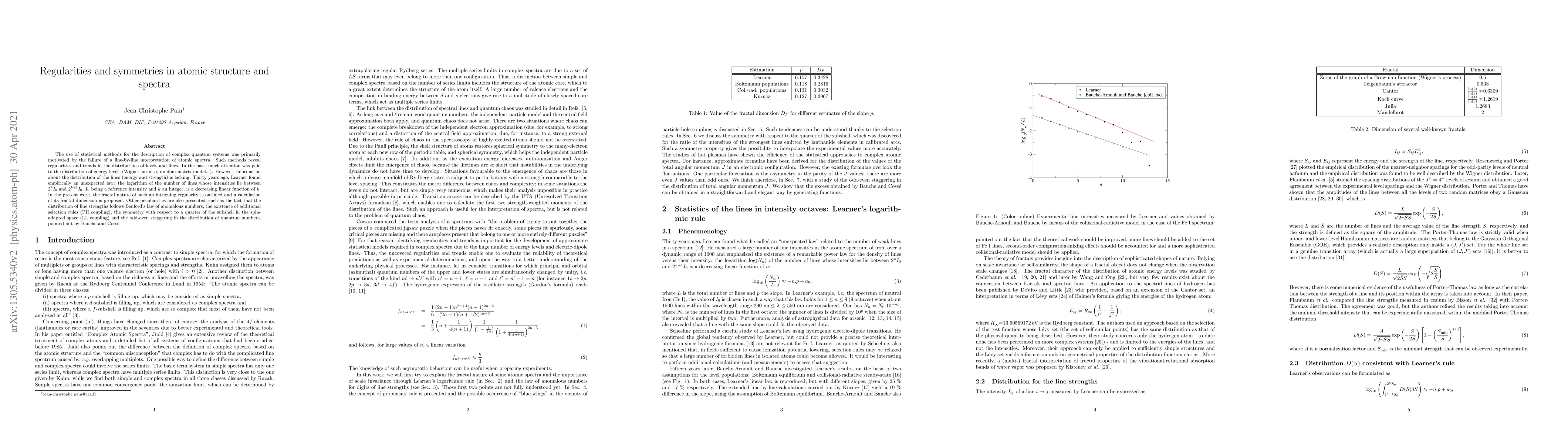 The use of statistical methods for the description of complex quantum systems was primarily motivated by the failure of a line-by-line interpretation of atomic spectra. Such methods reveal regularities and trends in the distributions of levels and lines. In the past, much attention was paid to the distribution of energy levels (Wigner surmise, random-matrix model...). However, information about the distribution of the lines (energy and strength) is lacking. Thirty years ago, Learner found empirically an unexpected law: the logarithm of the number of lines whose intensities lie between 2^kI_0 and 2^{k+1}I_0, I_0 being a reference intensity and k an integer, is a decreasing linear function of k. In the present work, the fractal nature of such an intriguing regularity is outlined and a calculation of its fractal dimension is proposed. Other peculiarities are also presented, such as the fact that the distribution of line strengths follows Benford's law of anomalous numbers, the existence of additional selection rules (PH coupling), the symmetry with respect to a quarter of the subshell in the spin-adapted space (LL coupling) and the odd-even staggering in the distribution of quantum numbers, pointed out by Bauche and Coss\'e.
